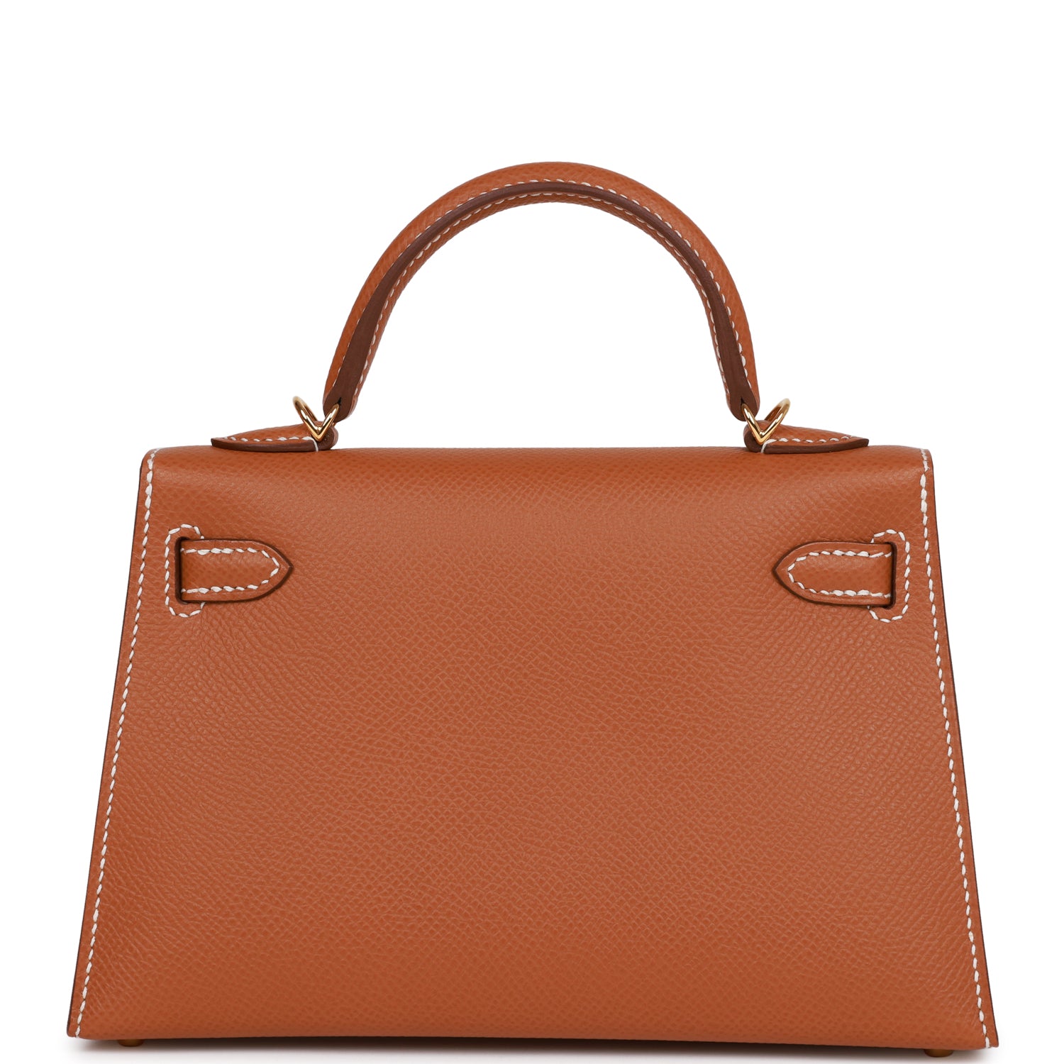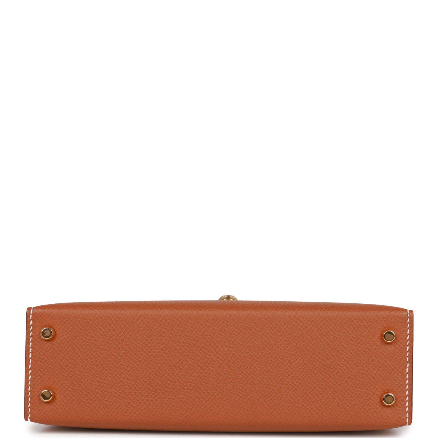 This tiny Kelly, in the Sellier style, is in gold epsom leather with gold hardware and has contrast stitching, two front straps with front toggle closure, single rolled handle and removable shoulder strap.