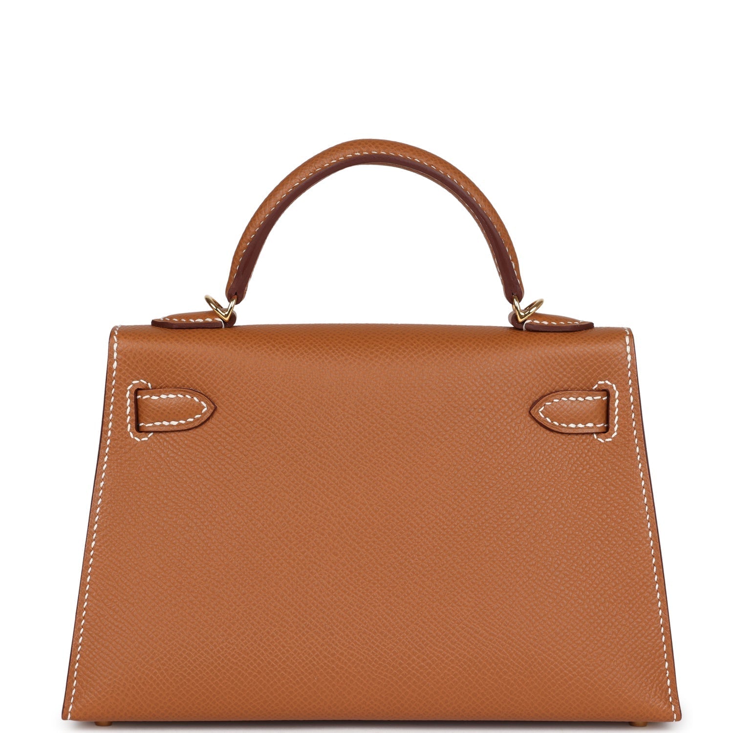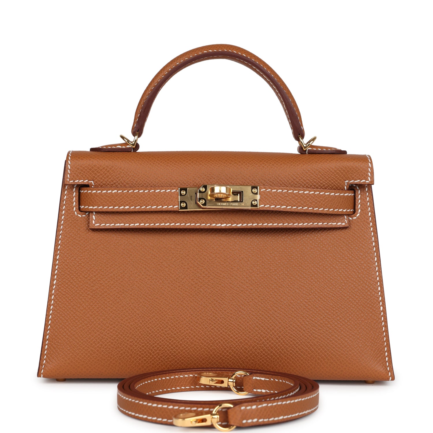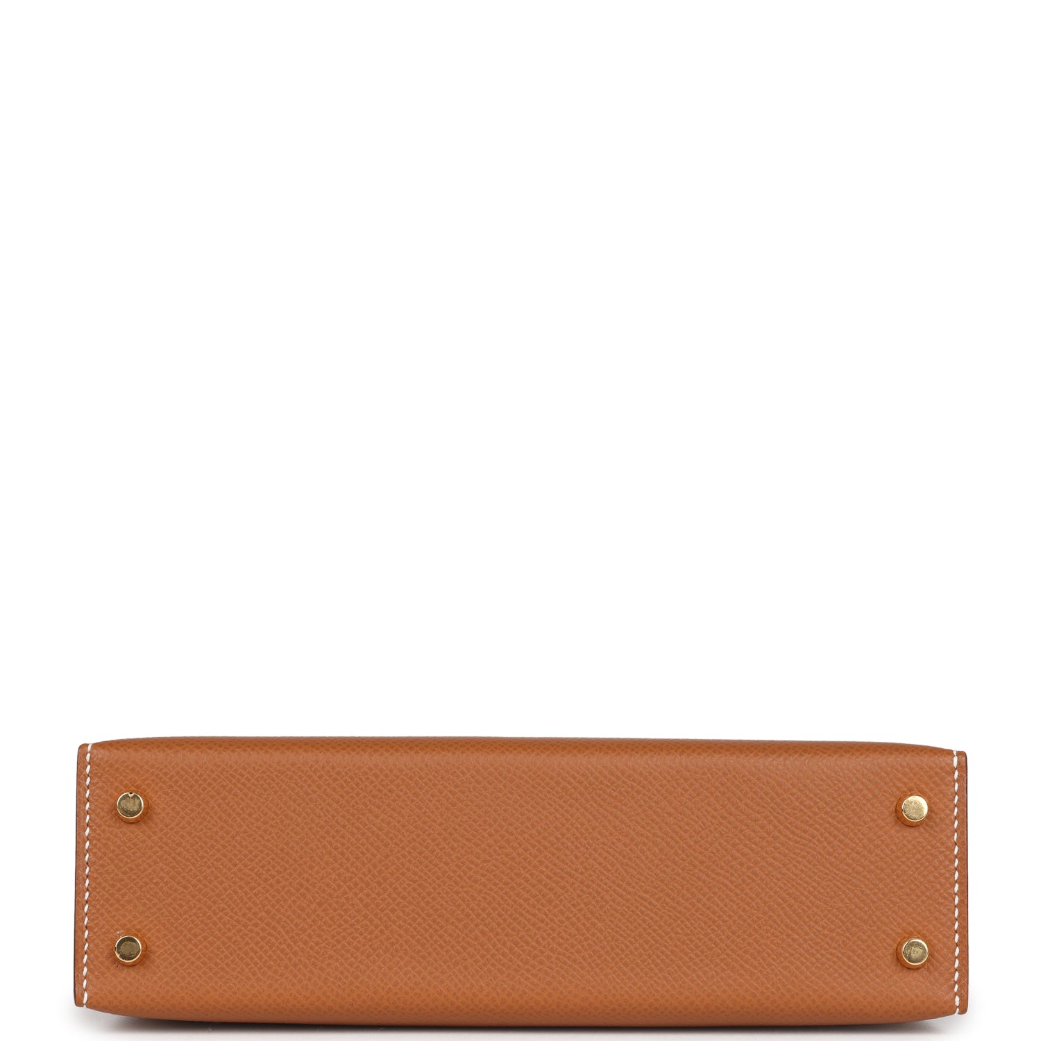 This Kelly, in the Sellier style, is in Gold epsom leather with gold hardware and has contrast stitching, two straps with front toggle closure, single rolled handle and removable shoulder strap.