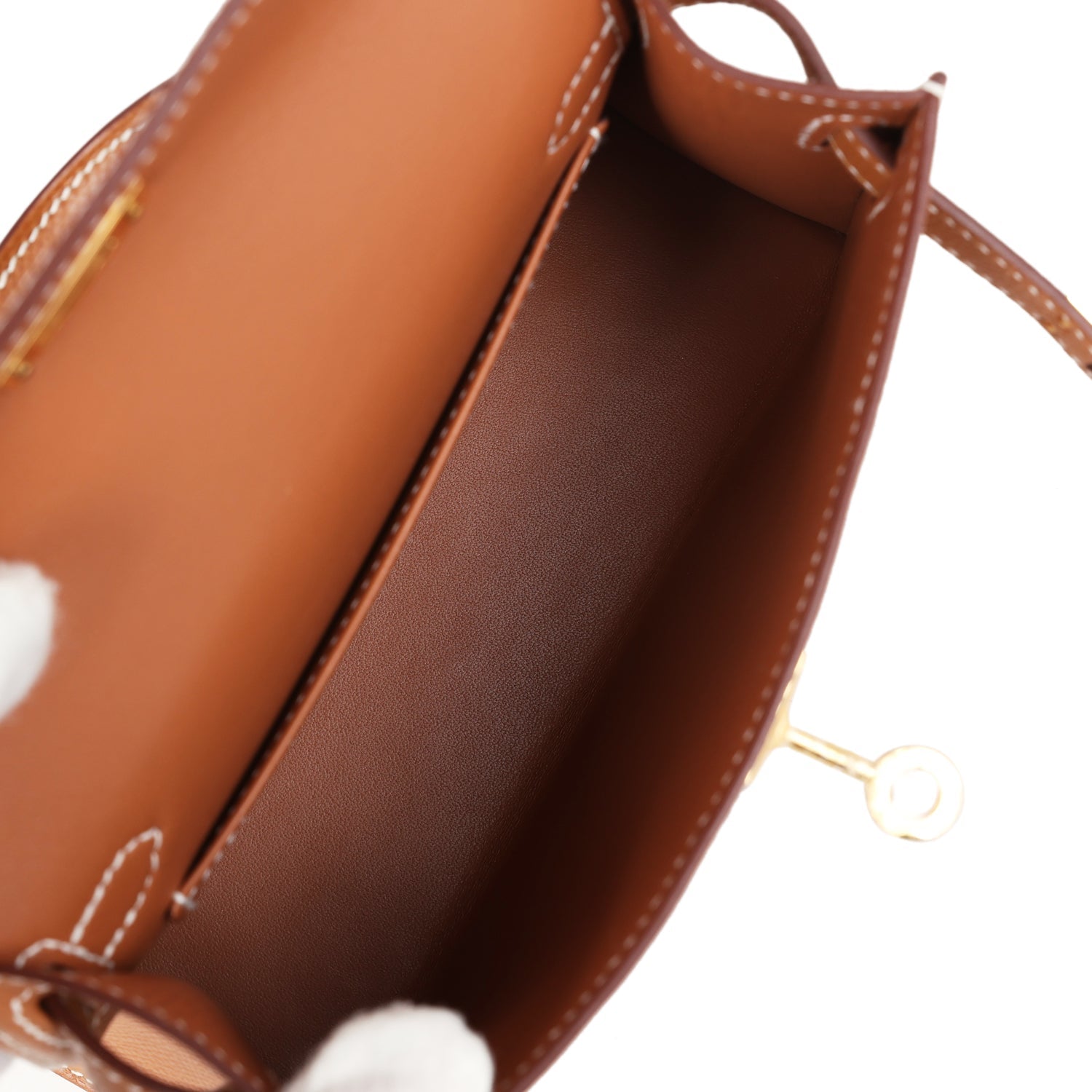 The interior is lined with Gold lambskin leather and has one open pocket on the back wall.