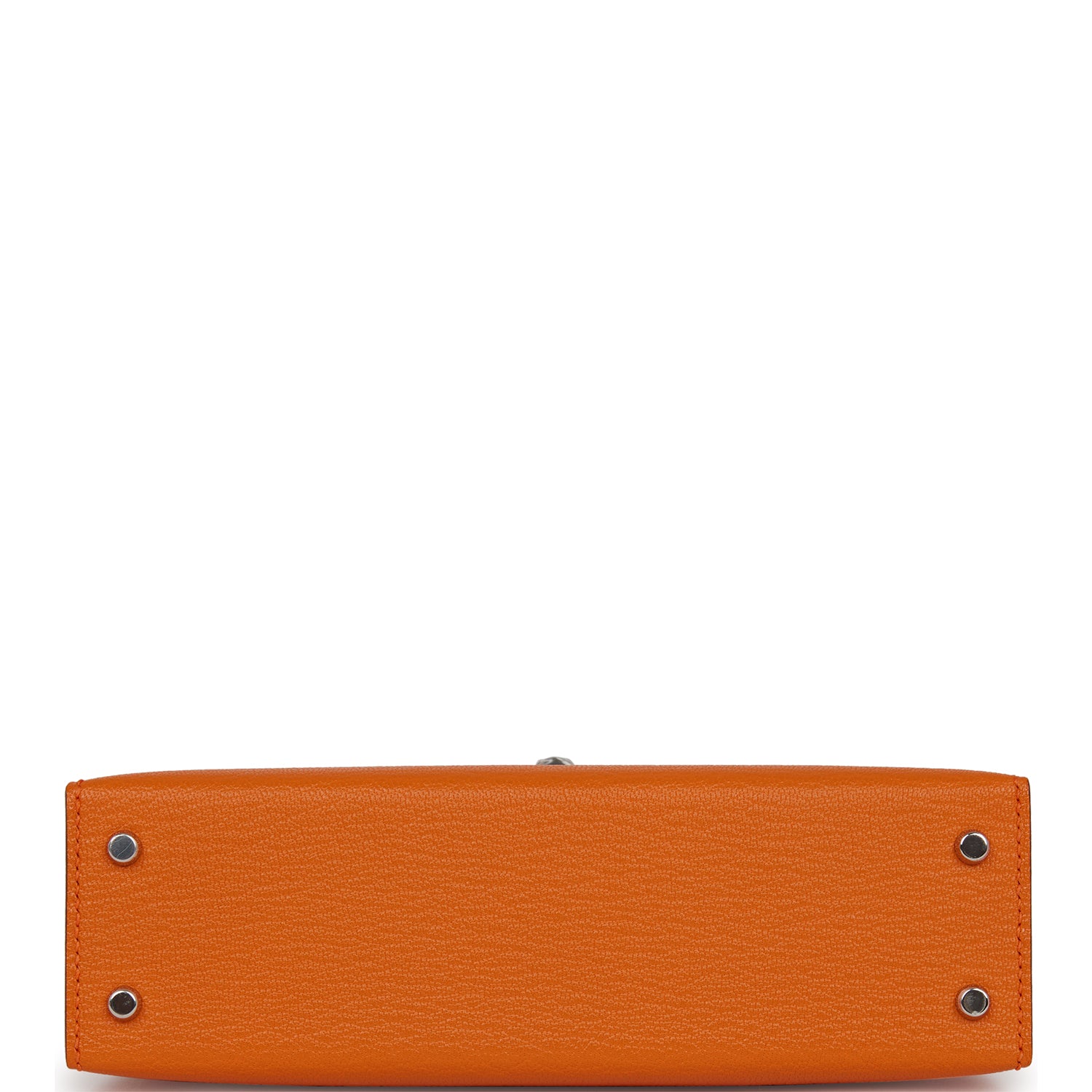 This Kelly, in the Sellier style, is in Orange chevre leather with palladium hardware and has tonal stitching, two straps with front toggle closure, single rolled handle and removable shoulder strap.