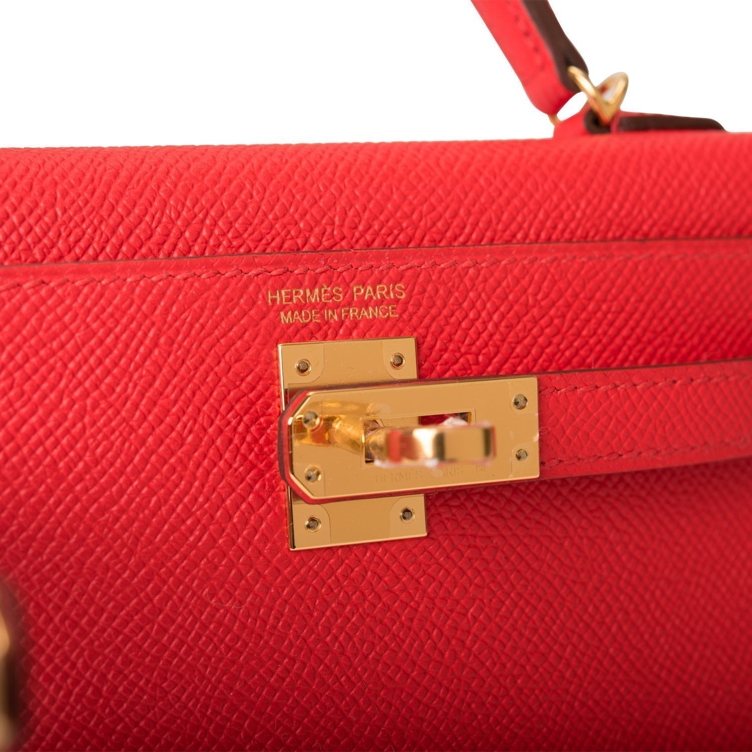 This Kelly, in the Sellier style, is in Rouge de Coeur epsom leather with gold hardware and has tonal stitching, two straps with front toggle closure, single rolled handle and removable shoulder strap.