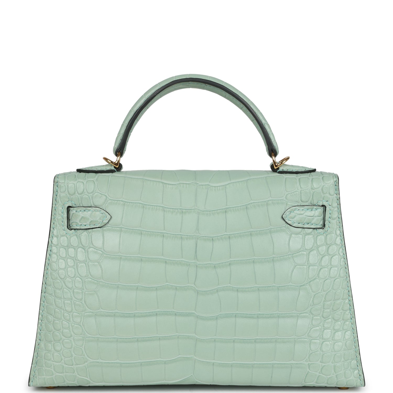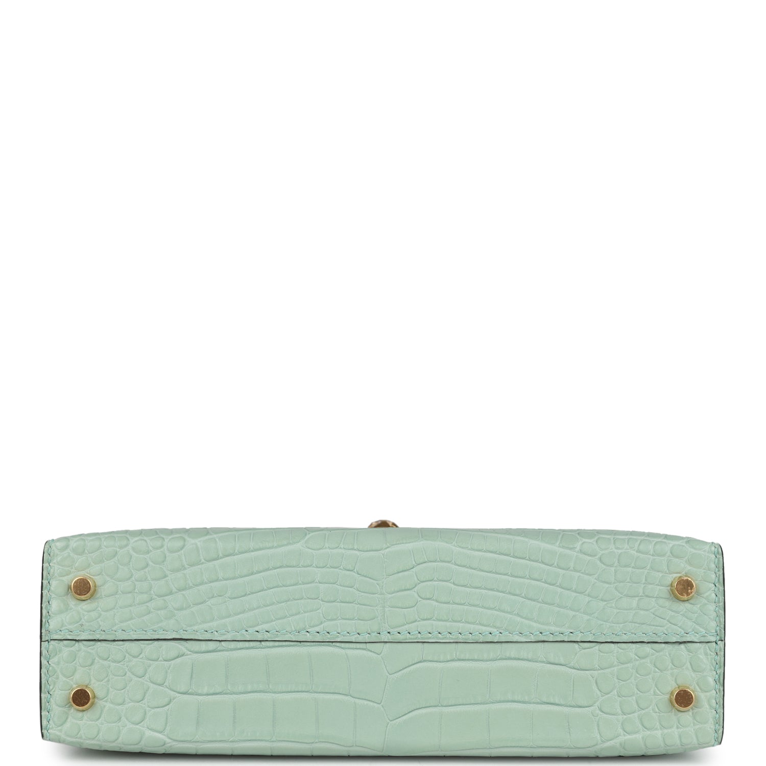 This Kelly, in the Sellier style, is in Vert D’Eau Matte Alligator leather with gold hardware and has tonal stitching, two straps with front toggle closure, single rolled handle and removable shoulder strap.