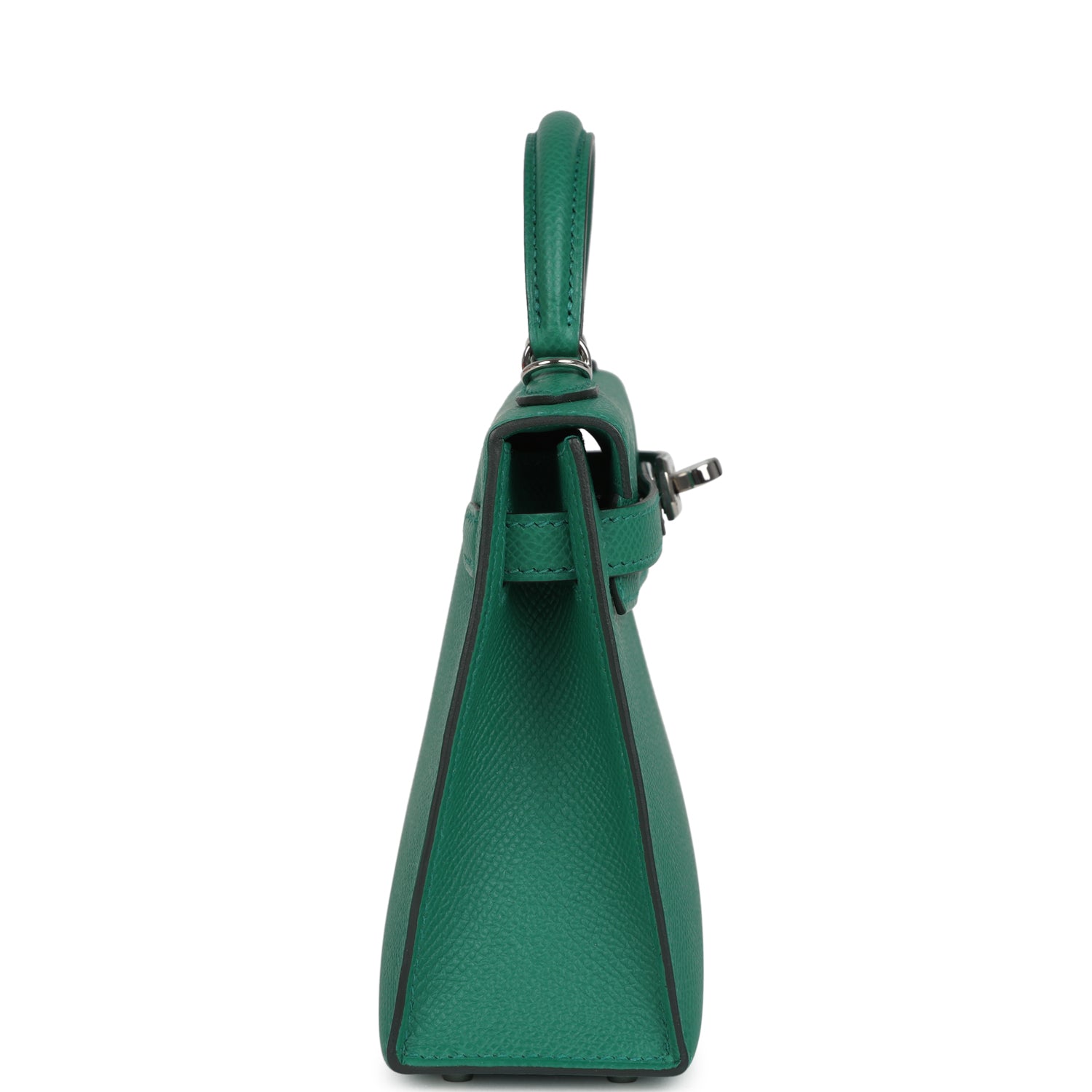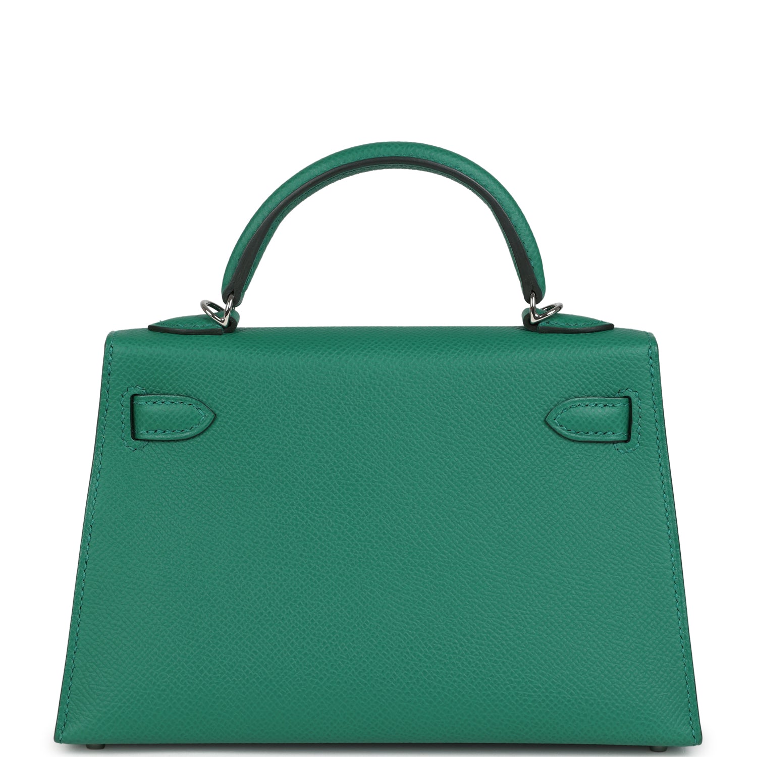 This Kelly, in the Sellier style, is in Vert Vertigo epsom leather with palladium hardware, has tonal stitching, two front straps with front toggle closure, single rolled handle and removable shoulder strap.