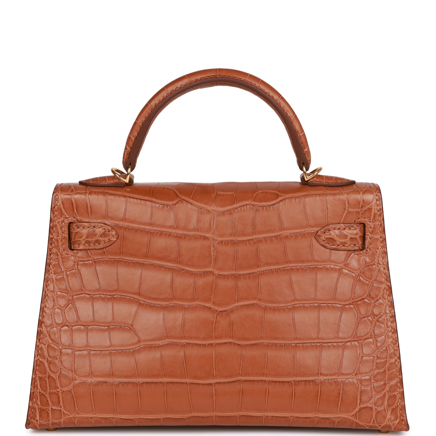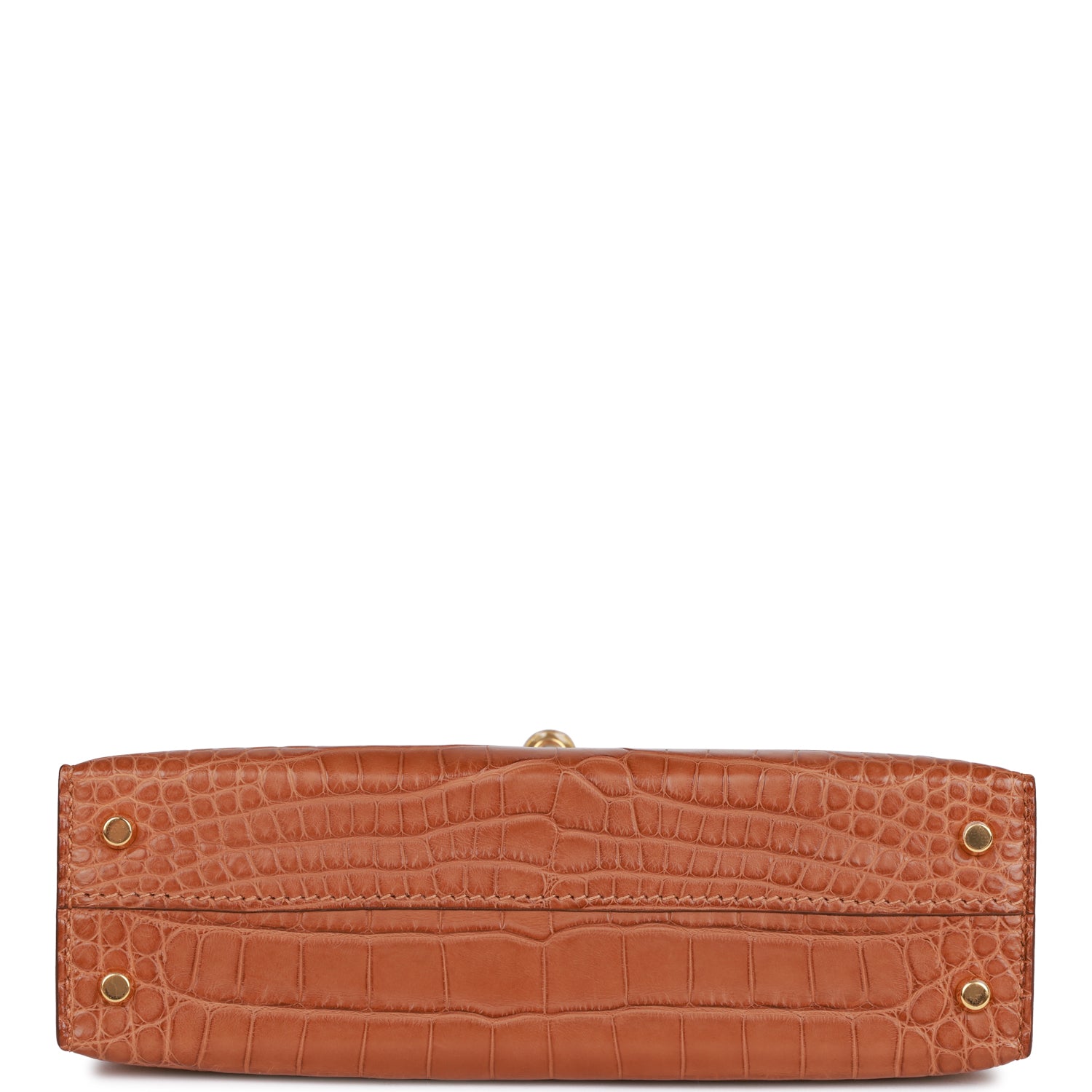 This tiny Kelly, in the Sellier style, is in Gold matte Mississippienis alligator with gold hardware and has tonal stitching, two front straps with front toggle closure, single rolled handle and removable shoulder strap.