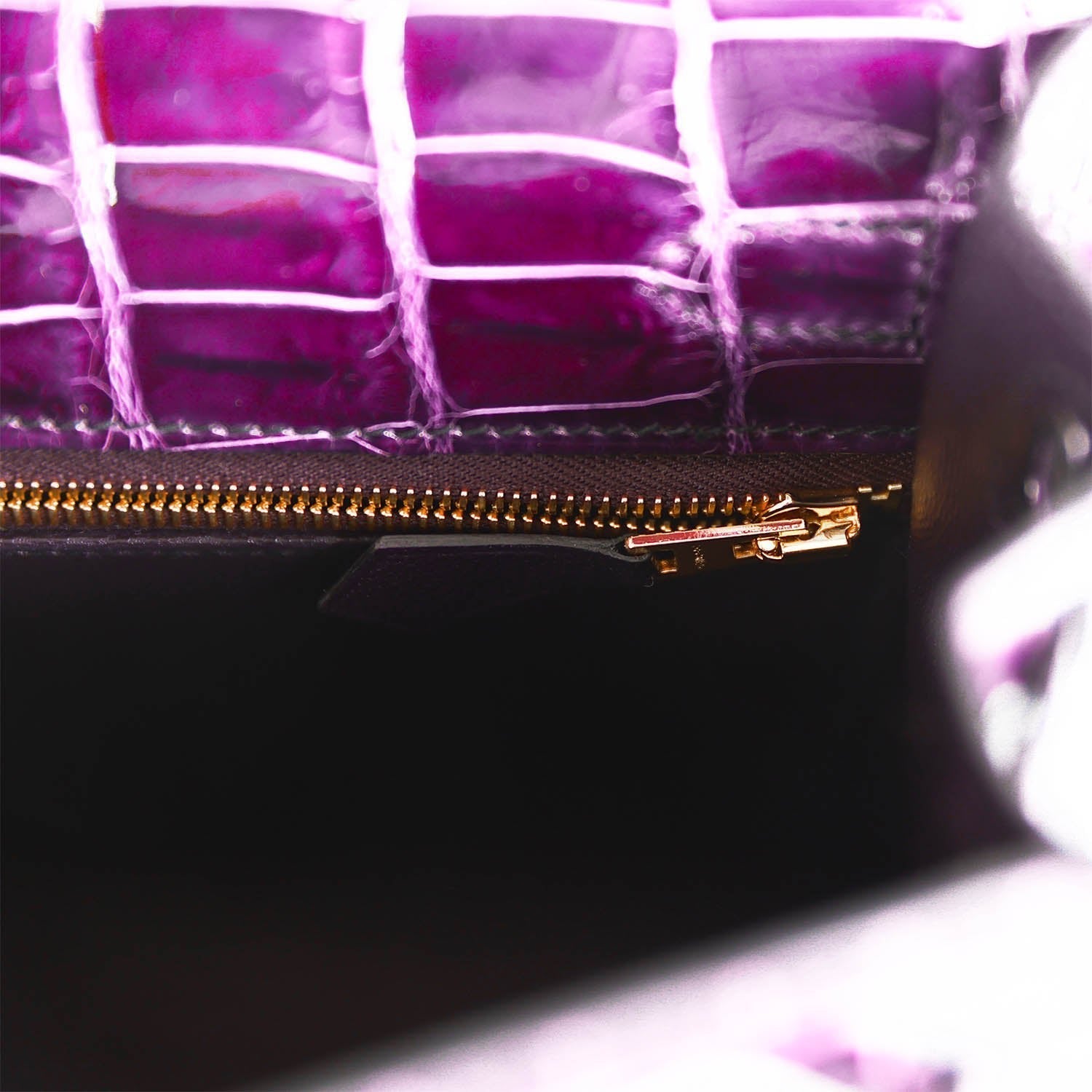 This Sellier Kelly is in Aubergine shiny Niloticus crocodile with gold hardware and has tonal stitching, front flap, two straps with center toggle closure, clochette with lock and two keys, single rolled handle and removable strap.