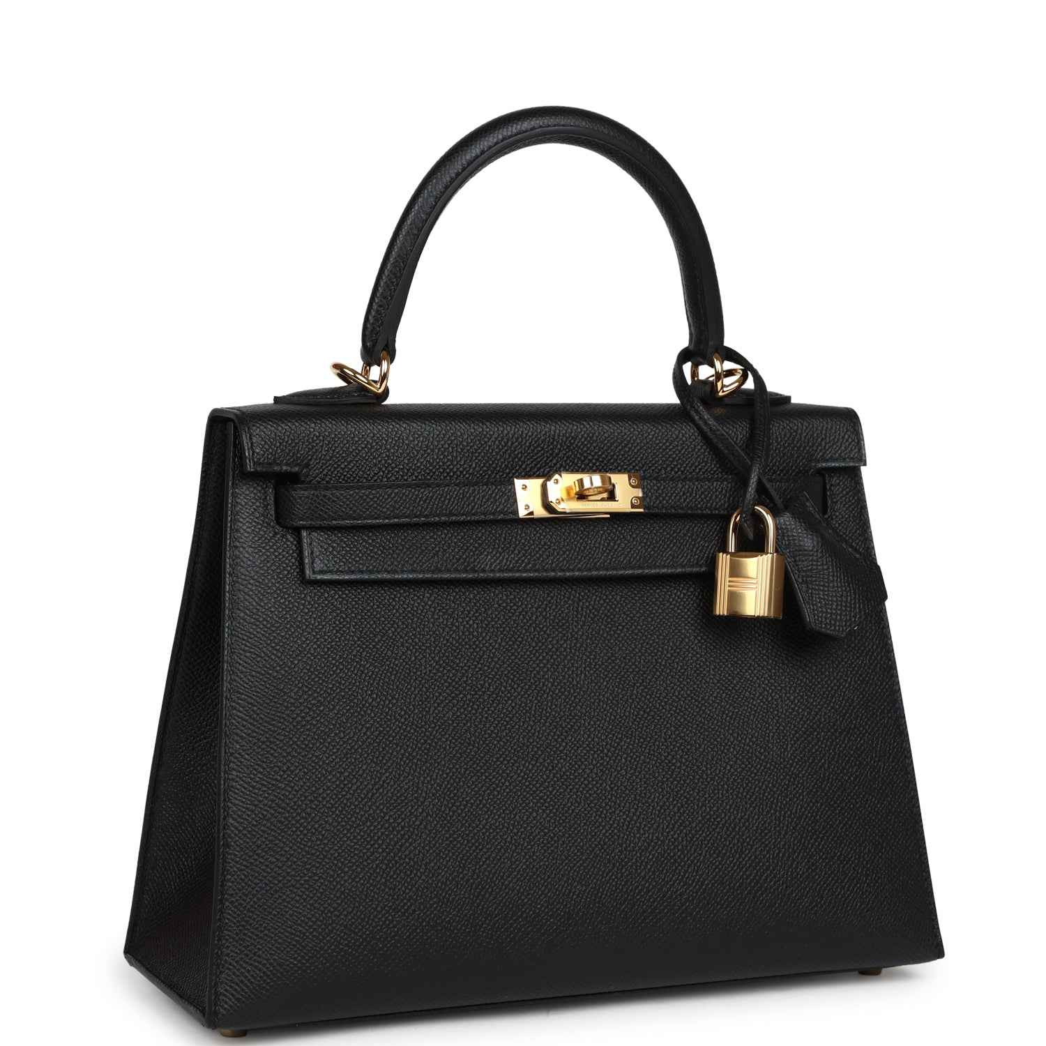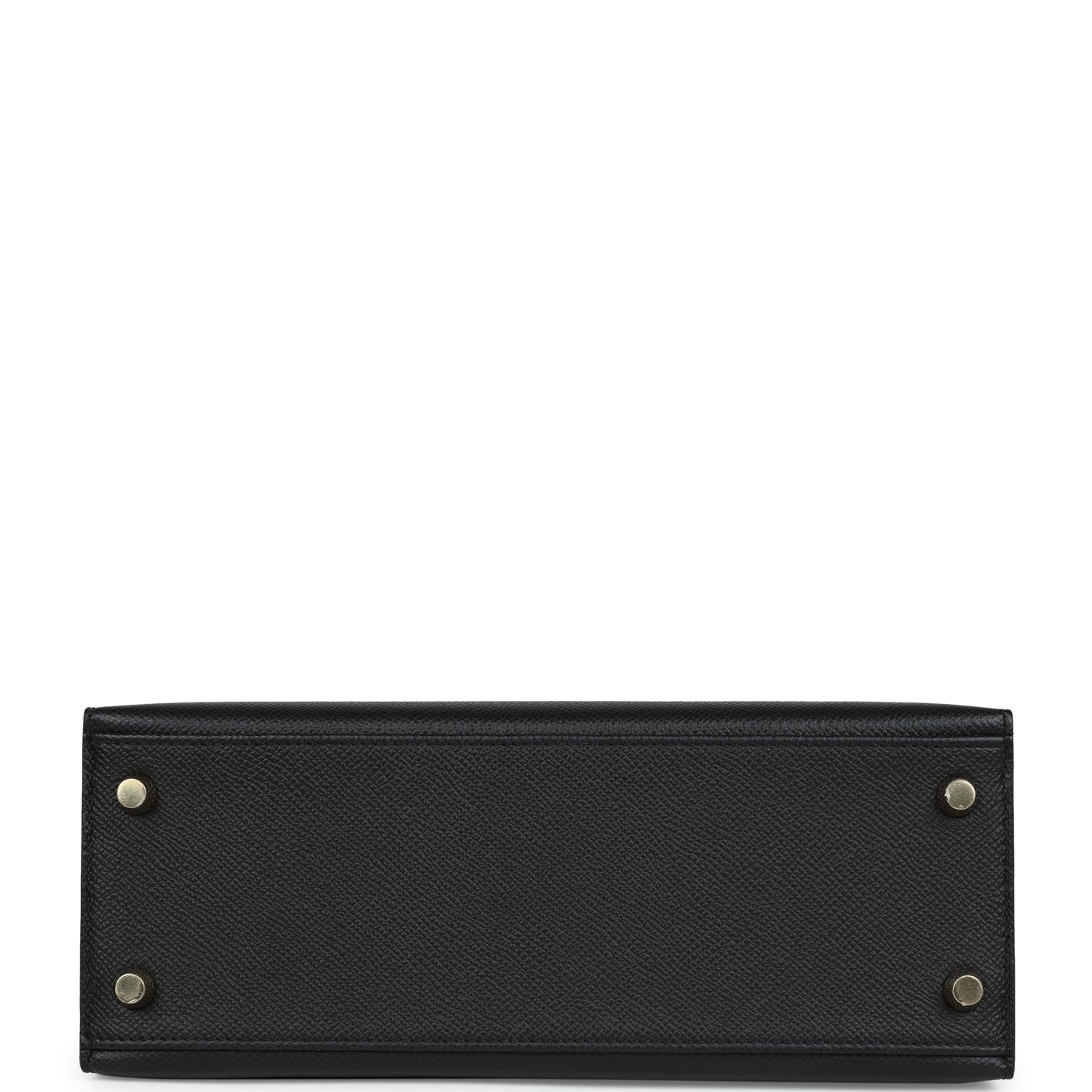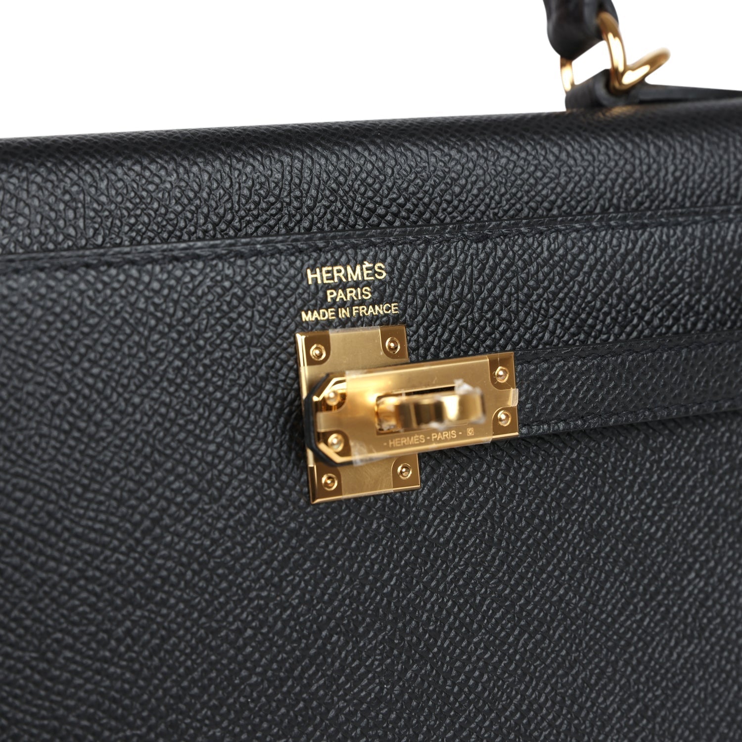 This Kelly, in the Sellier style, is in Black epsom leather with gold hardware and has tonal stitching, front flap, two straps with center toggle closure, clochette with lock and two keys a single rolled handle and removable shoulder strap.