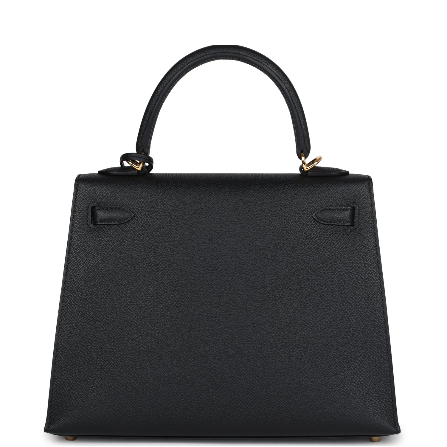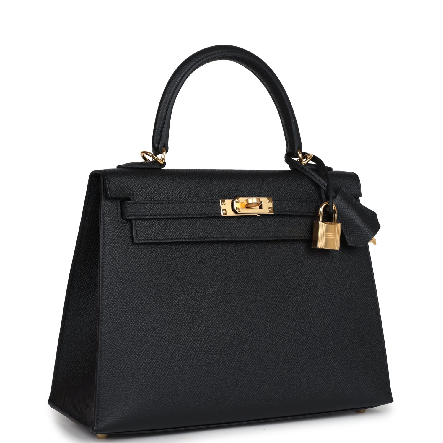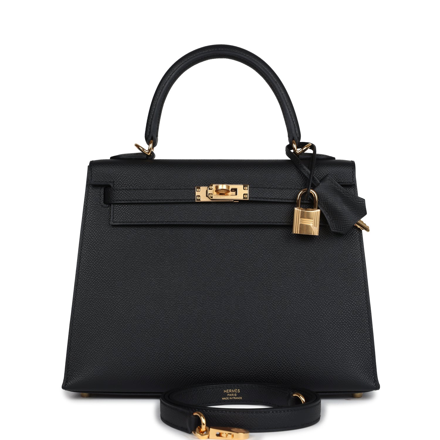 This Kelly, in the Sellier style, is in Black epsom leather with gold hardware and has tonal stitching, front flap, two straps with center toggle closure, clochette with lock and two keys a single rolled handle and removable shoulder strap.