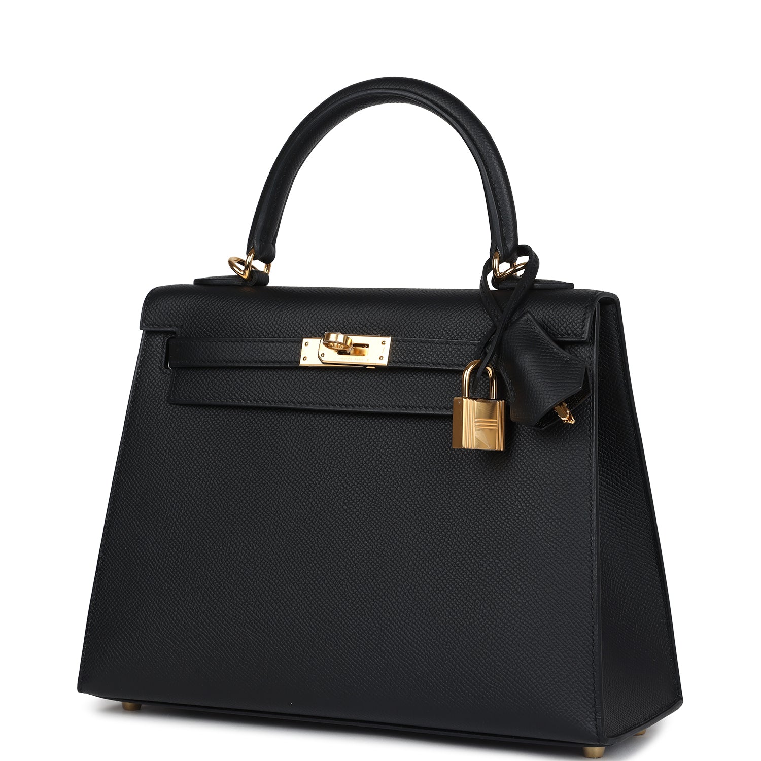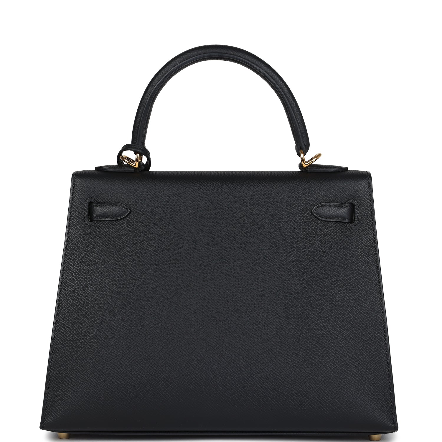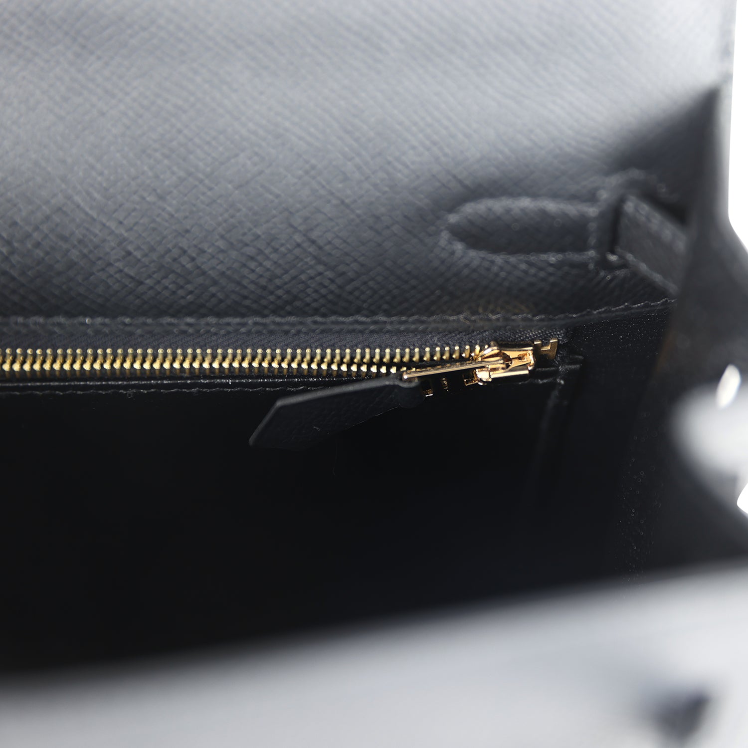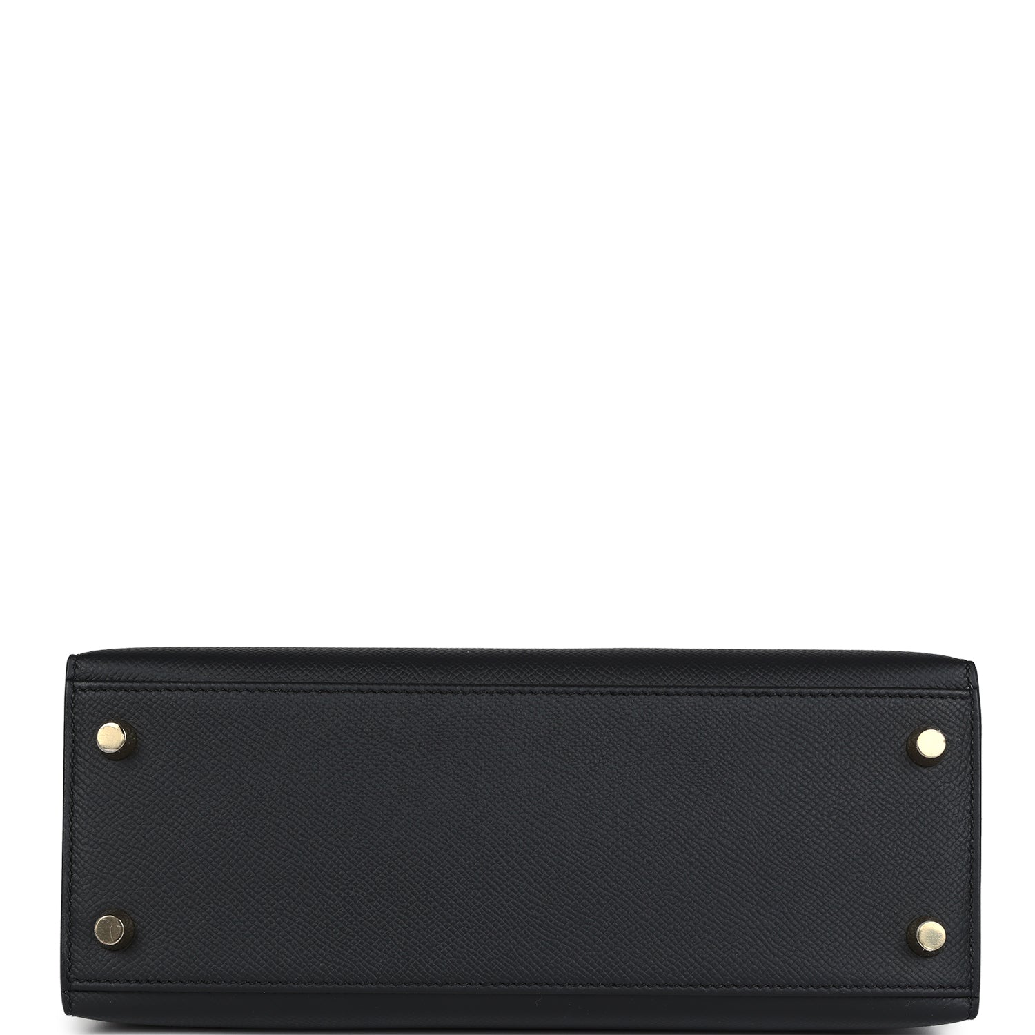 This Kelly, in the Sellier style, is in Black epsom leather with gold hardware and has tonal stitching, front flap, two straps with center toggle closure, clochette with lock and two keys a single rolled handle and removable shoulder strap.
