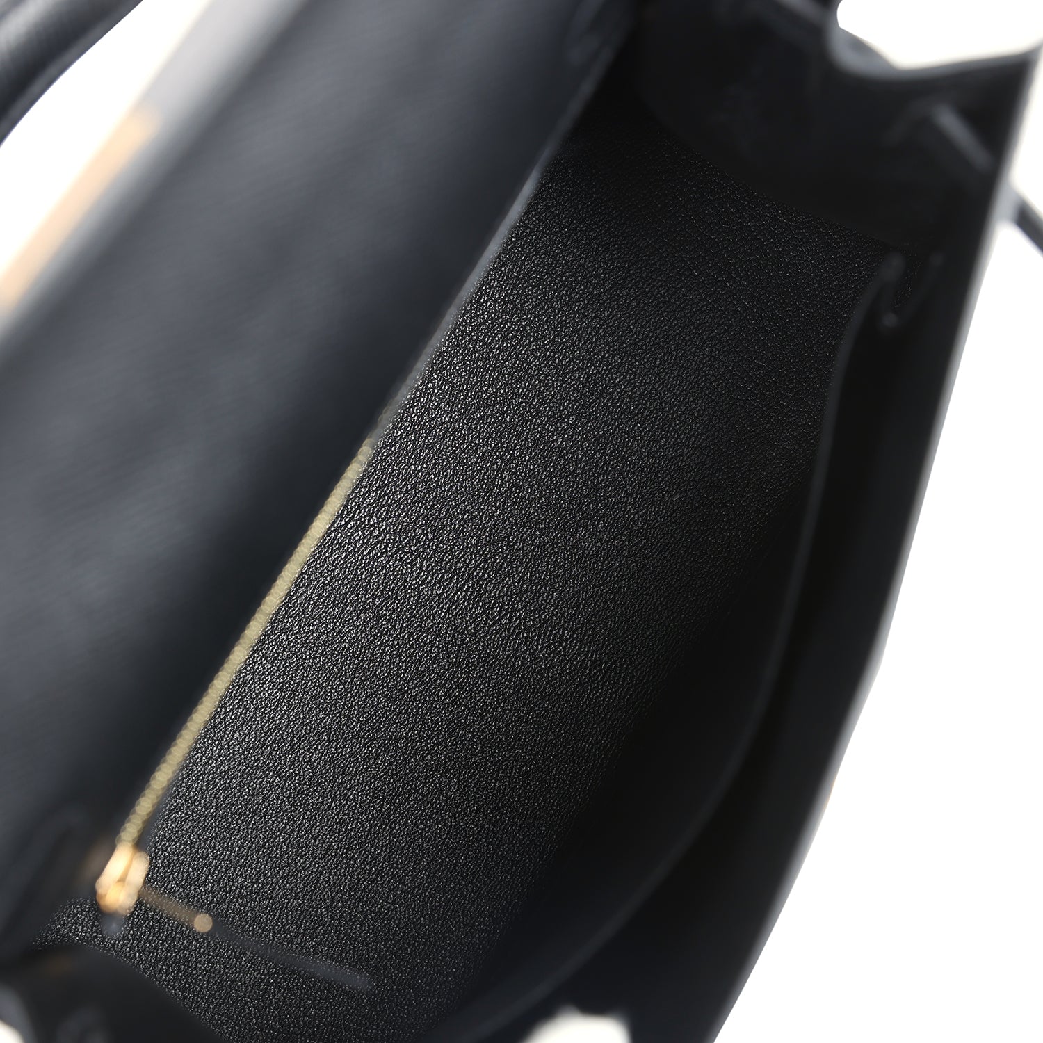 The interior is lined with Black chevre leather and has one zip pocket with an Hermes engraved pull and one open pocket on the opposite side.