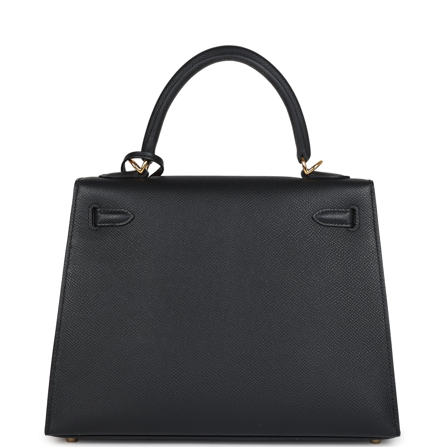 This Kelly, in the Sellier style, is in Black epsom leather with gold hardware and has tonal stitching, front flap, two straps with center toggle closure, clochette with lock and two keys a single rolled handle and removable shoulder strap.
