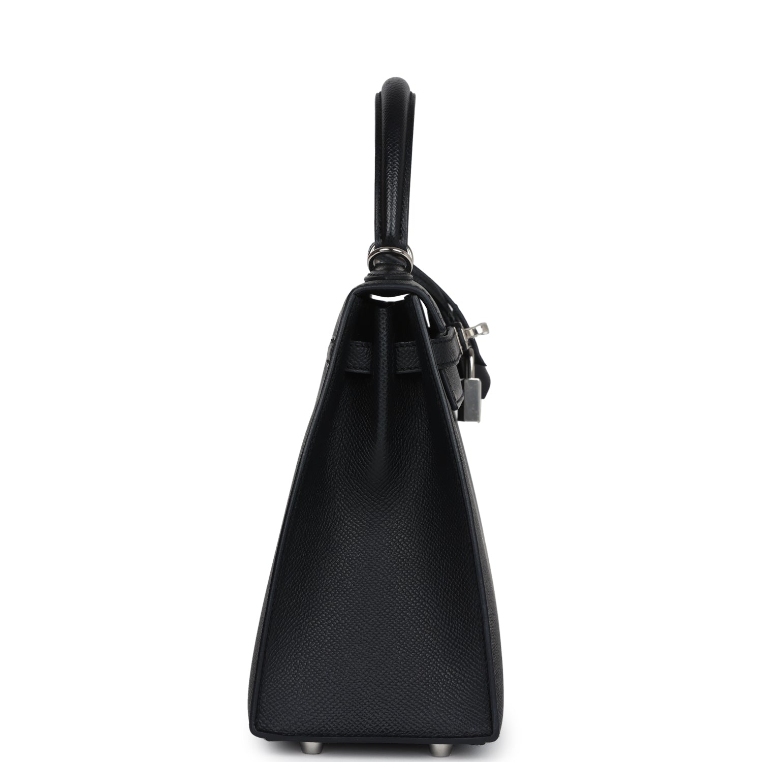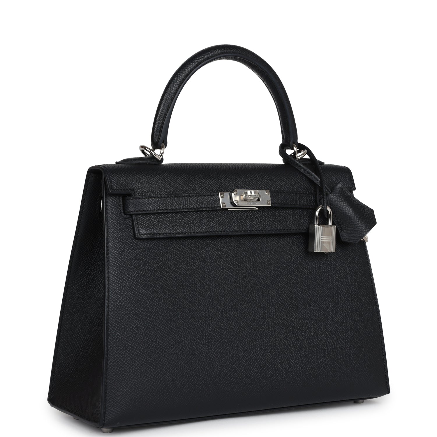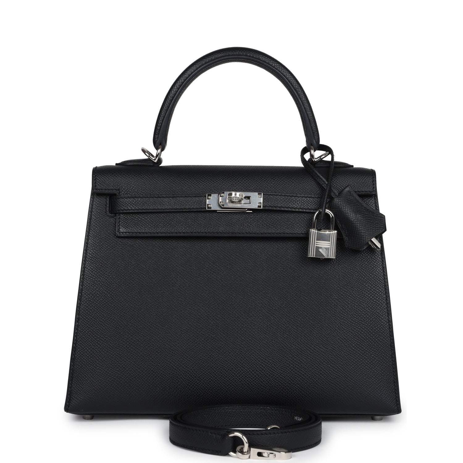 This Kelly, in the Sellier style, in Black epsom leather with palladium hardware, has tonal stitching, front flap, two straps with center toggle closure, clochette with lock and two keys, single rolled handle and a removable shoulder strap.