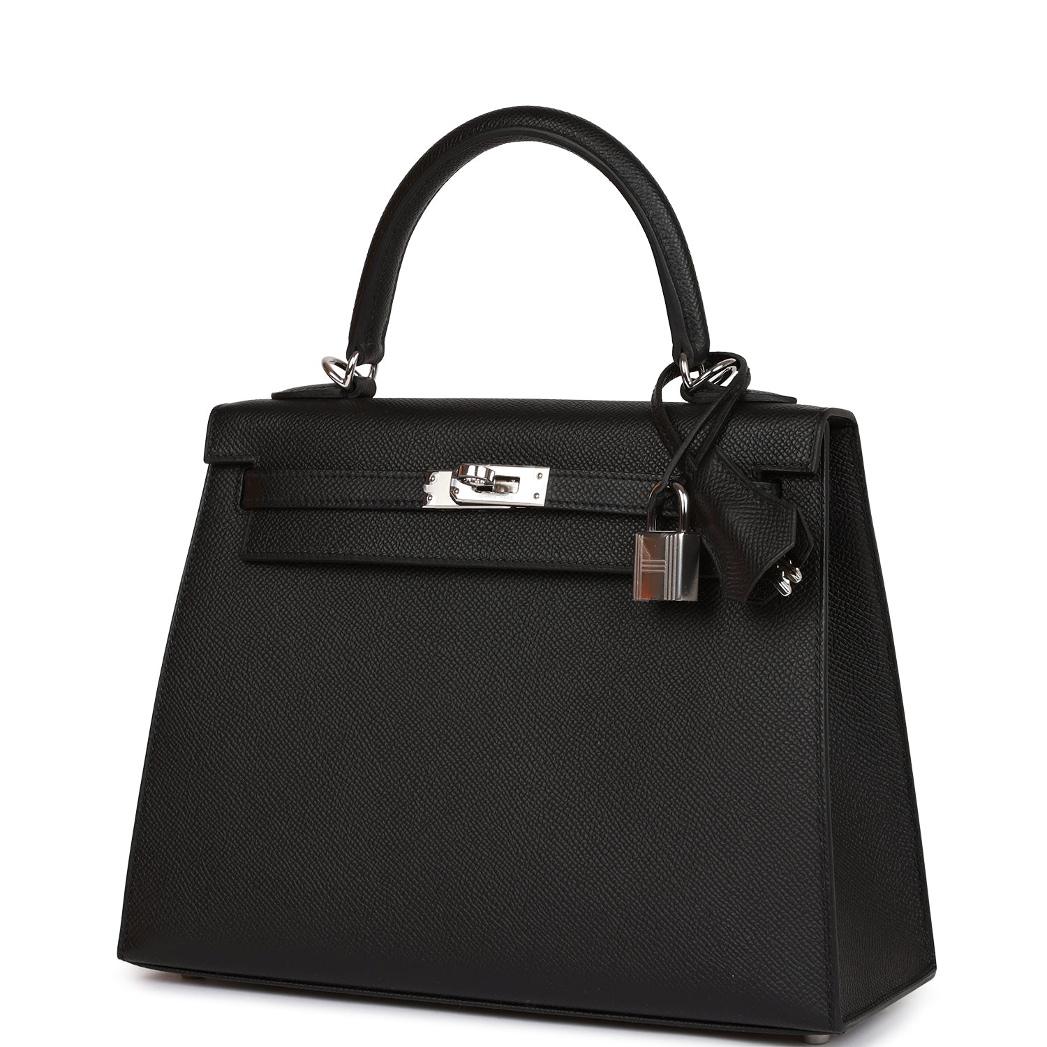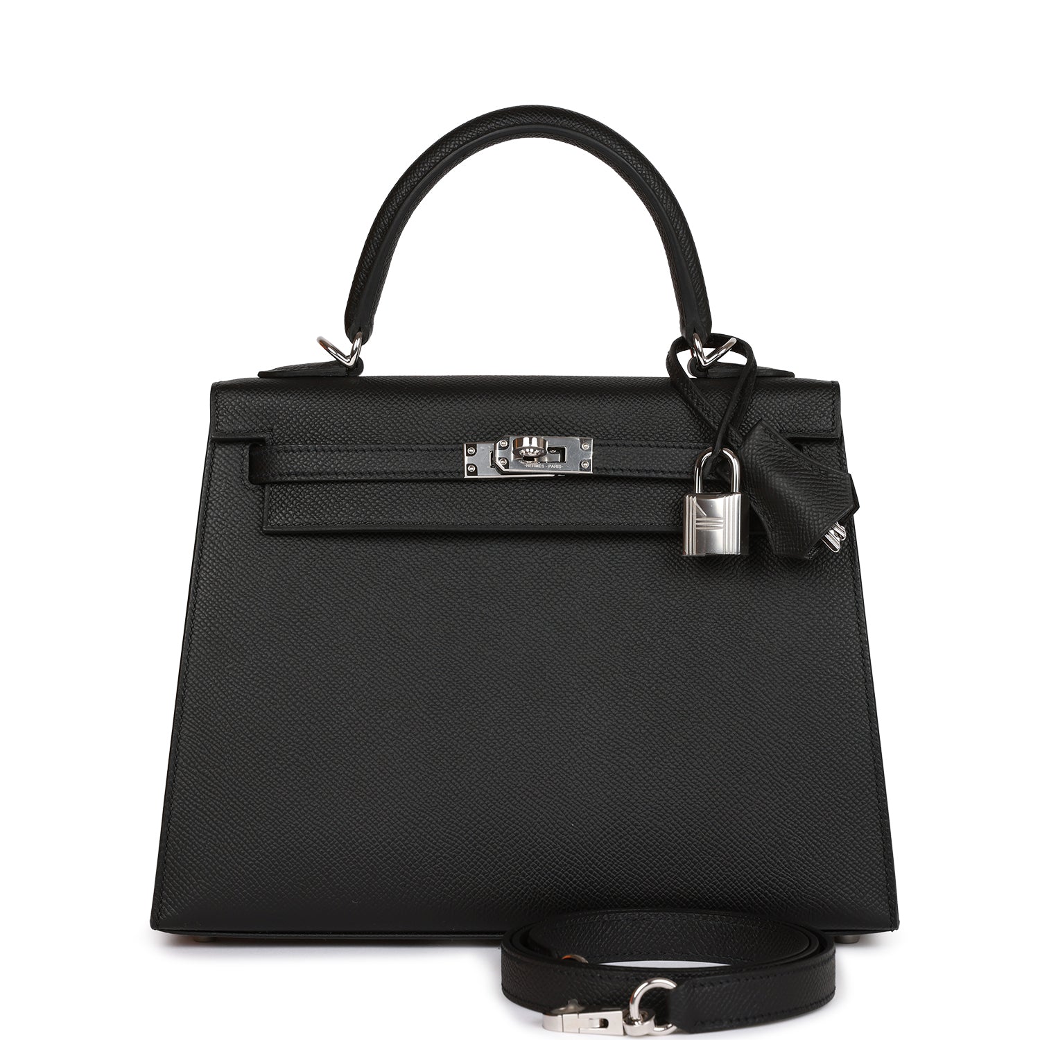 This Kelly, in the Sellier style, is in Black epsom leather with palladium hardware and has tonal stitching two straps with front toggle closure, clochette with lock and two keys, a single rolled handle and removable shoulder strap.