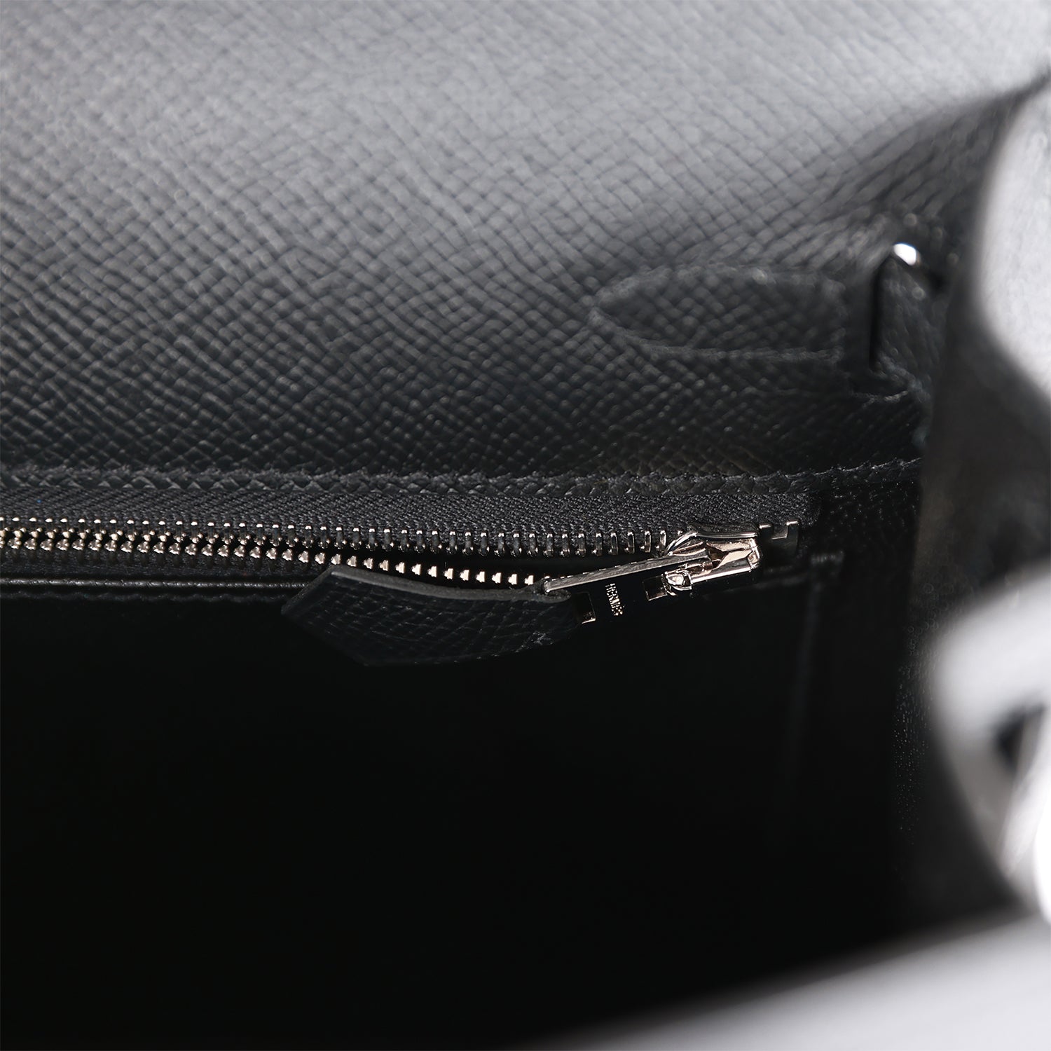 The interior is lined with black chevre leather and has one zip pocket with an Hermes engraved pull and one open pocket on the opposite side.