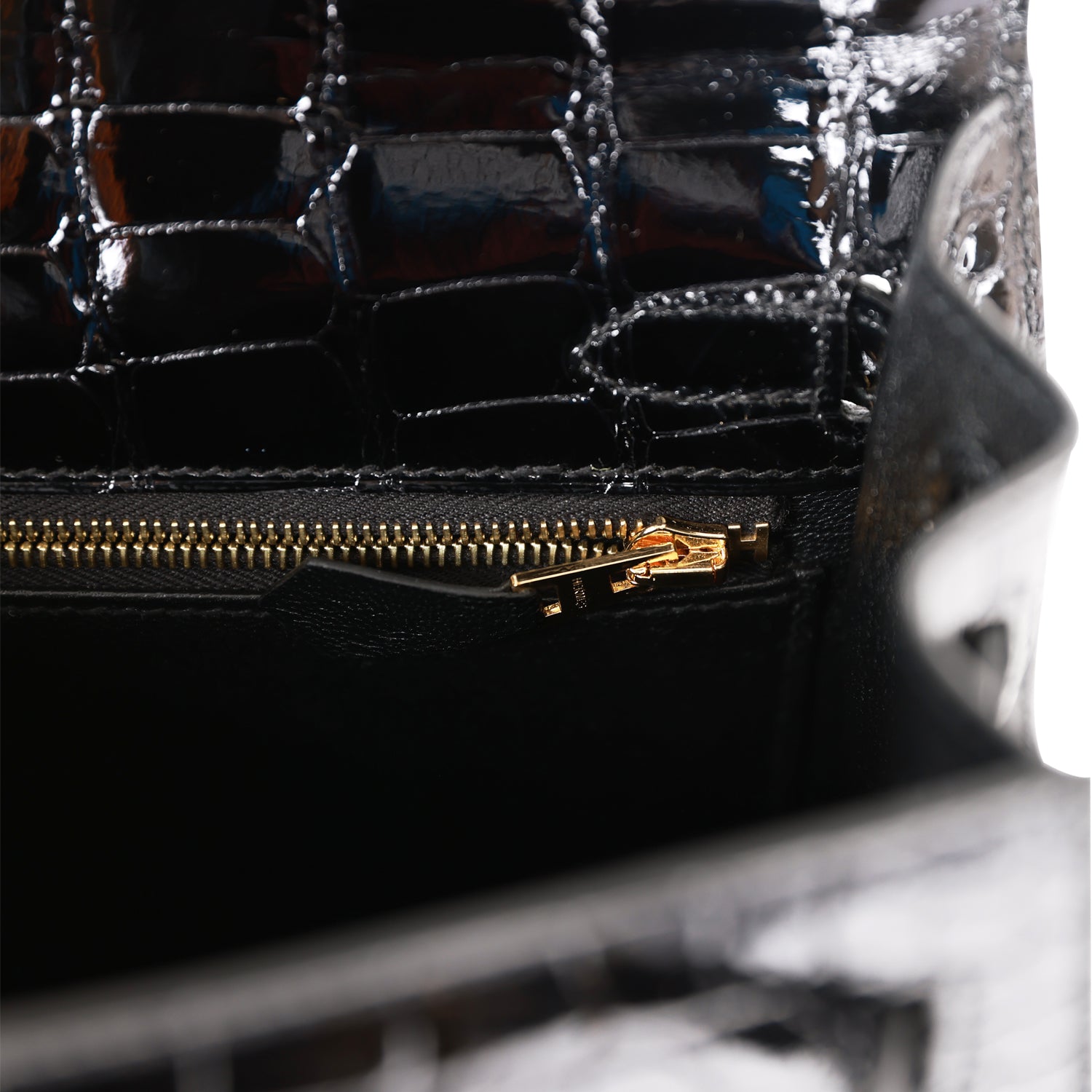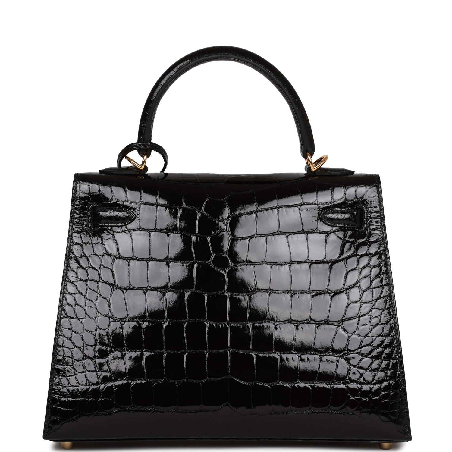 This Sellier Kelly is in Black shiny alligator with gold hardware and has tonal stitching, front flap, two straps with center toggle closure, clochette with lock and two keys, single rolled handle and removable strap.