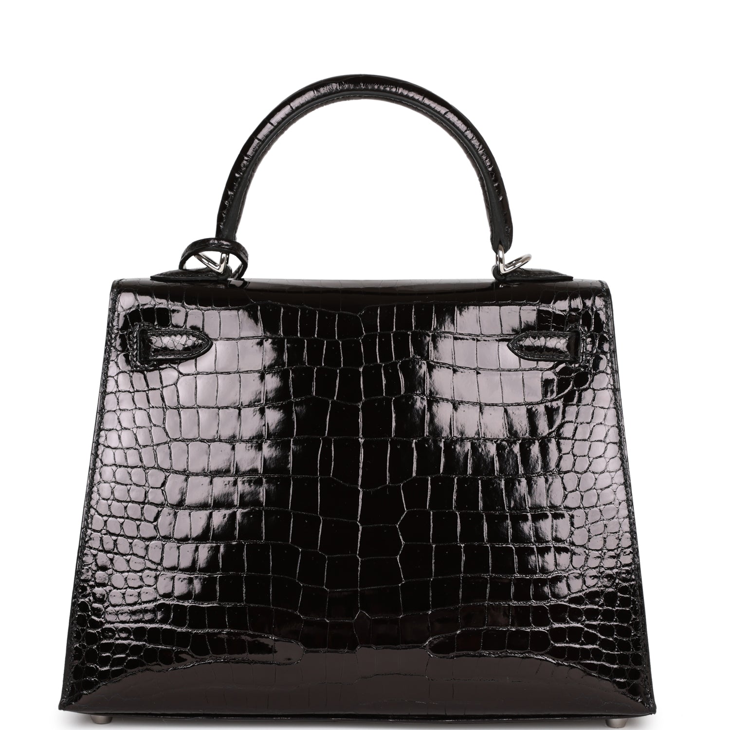 This Kelly, in the sellier style, is in Black shiny Porosus crocodile with palladium hardware and has tonal stitching, front flap, two straps with center toggle closure, clochette with lock and two keys, single rolled handle and removable strap.