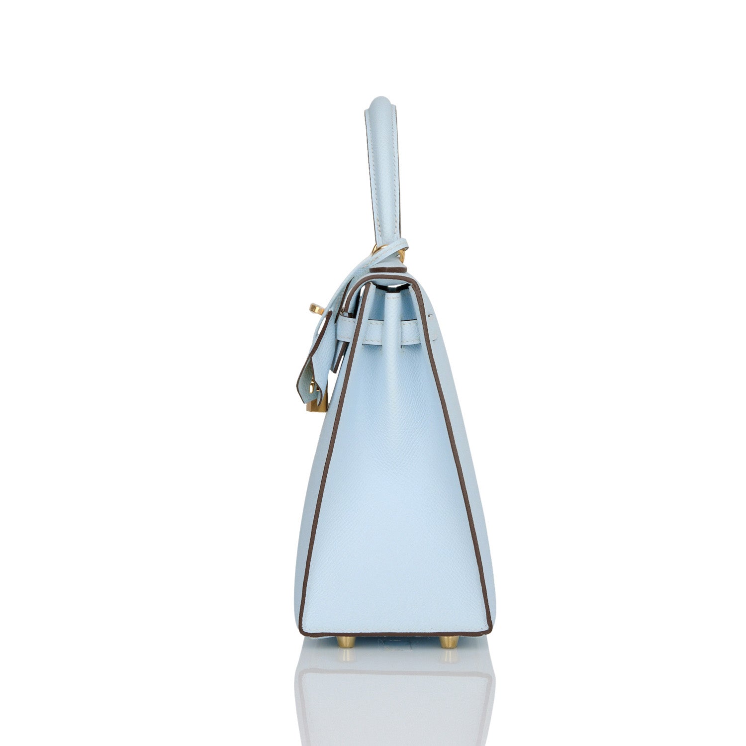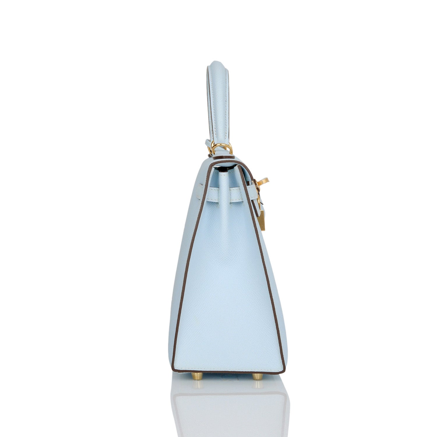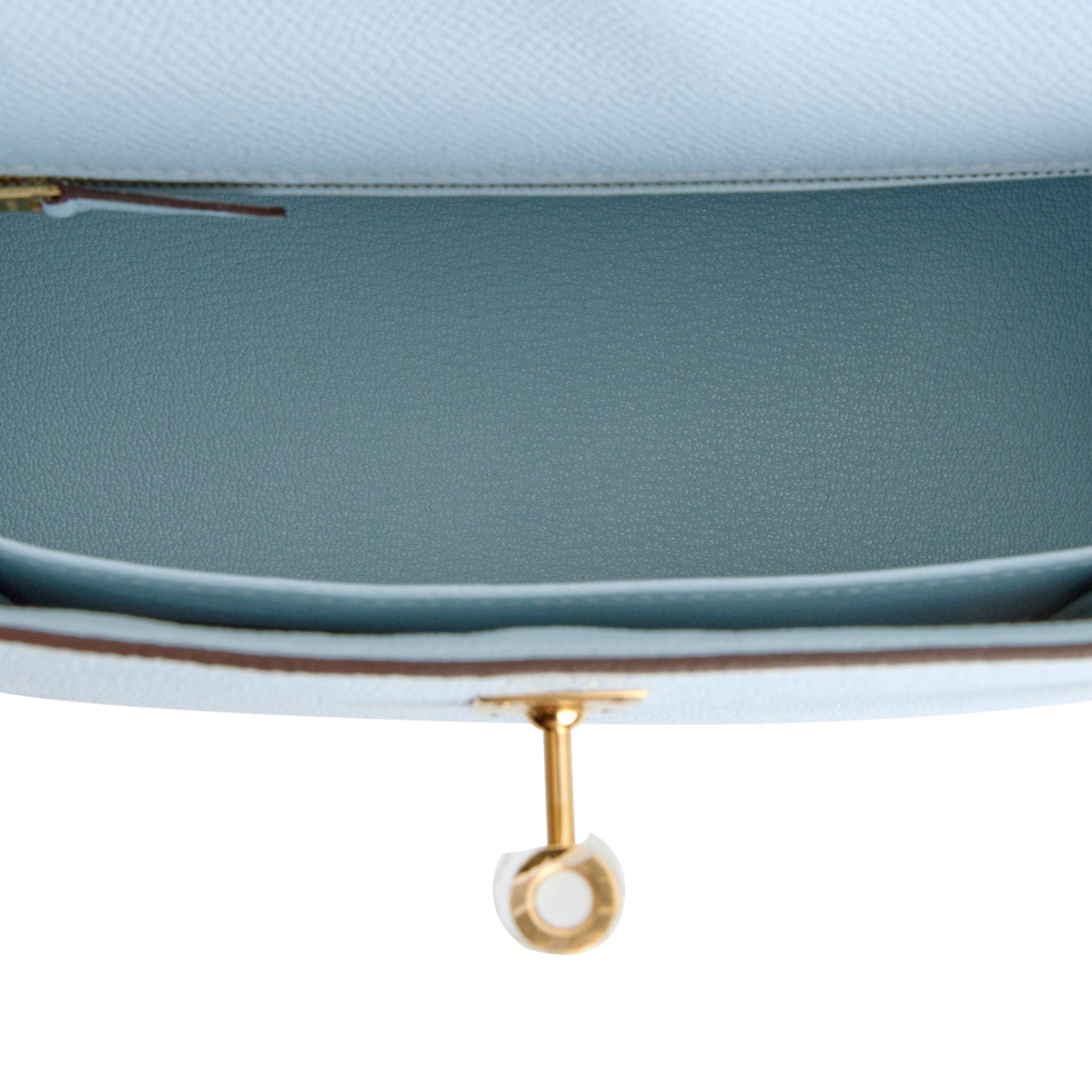 This Kelly, in the Sellier style, is in Bleu Brume epsom leather with gold hardware and has tonal stitching, front flap, two straps with center toggle closure, clochette with lock and two keys a single rolled handle and removable shoulder strap.
