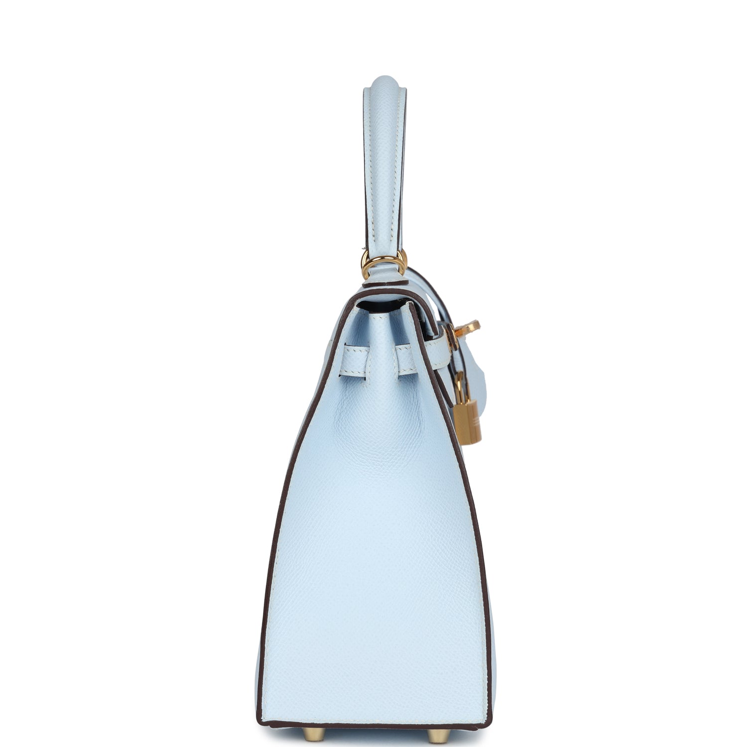 This Kelly, in the Sellier style, is in Bleu Brume epsom leather with gold hardware and has contrast stitching, front flap, two straps with center toggle closure, clochette with lock and two keys a single rolled handle and removable shoulder strap.