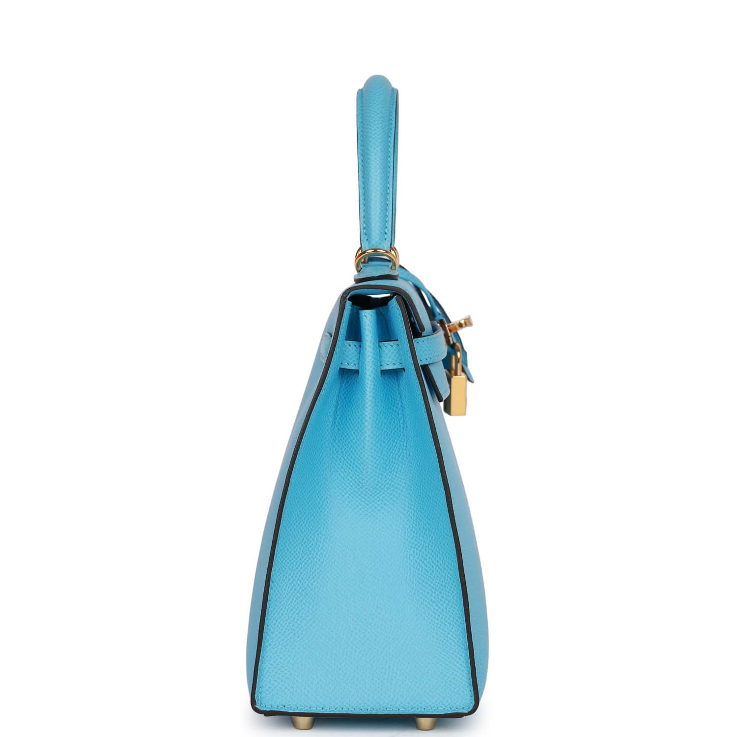 This Kelly, in the Sellier style, is in Celeste epsom leather with gold hardware and has tonal stitching, two front straps with toggle closure, clochette with lock and two keys, single rolled handle and removable shoulder strap.