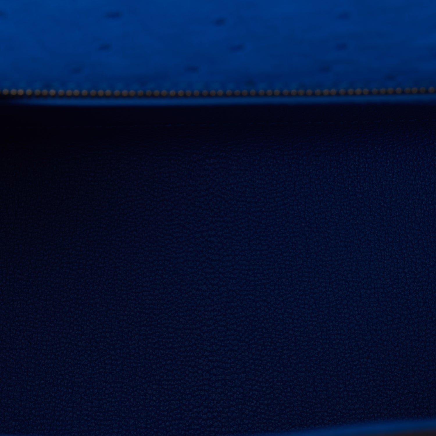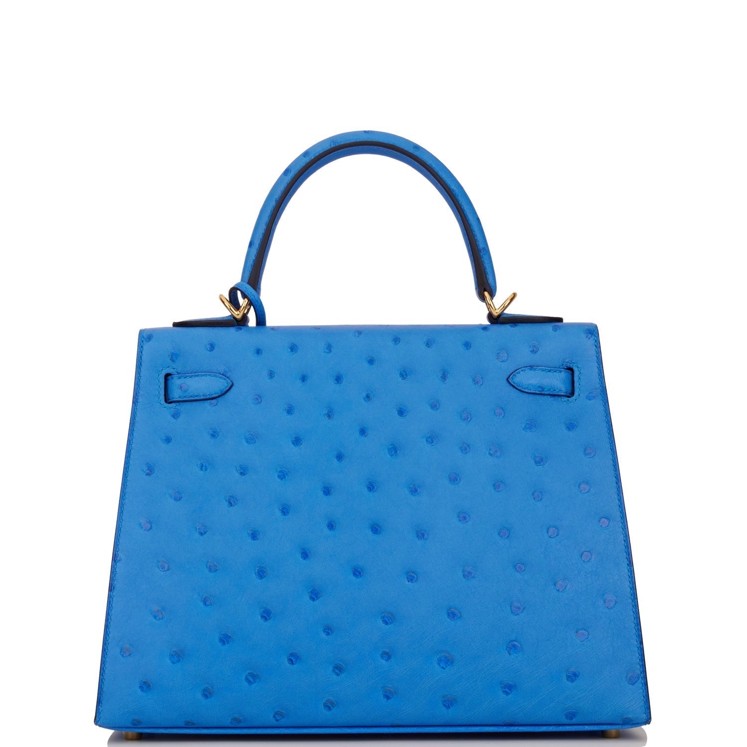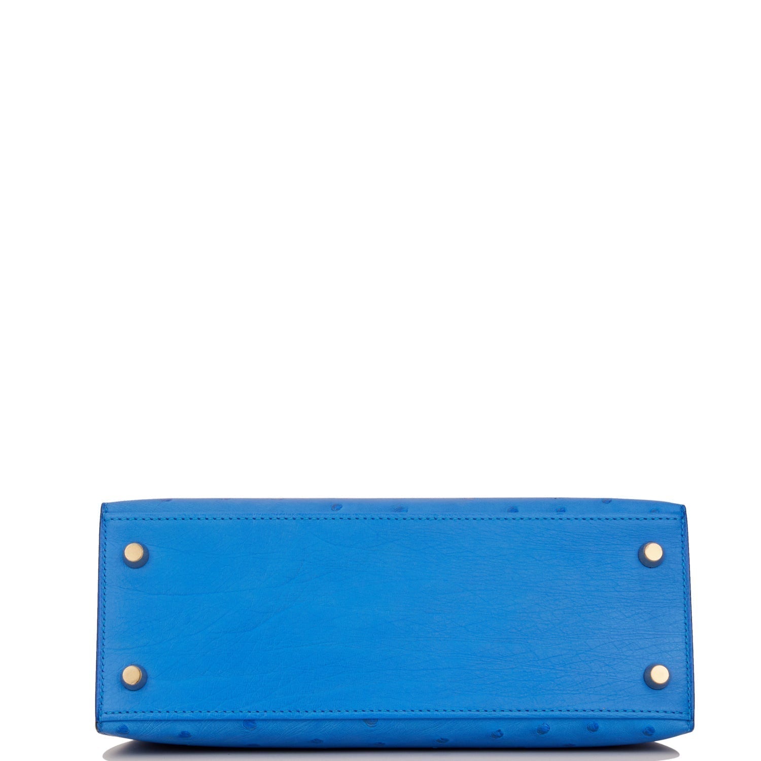 This Kelly, in the Sellier style, is in Bleuet Ostrich with gold hardware and has tonal stitching, two straps with front toggle closure, clochette with lock and two keys, single rolled handle and removable shoulder strap.