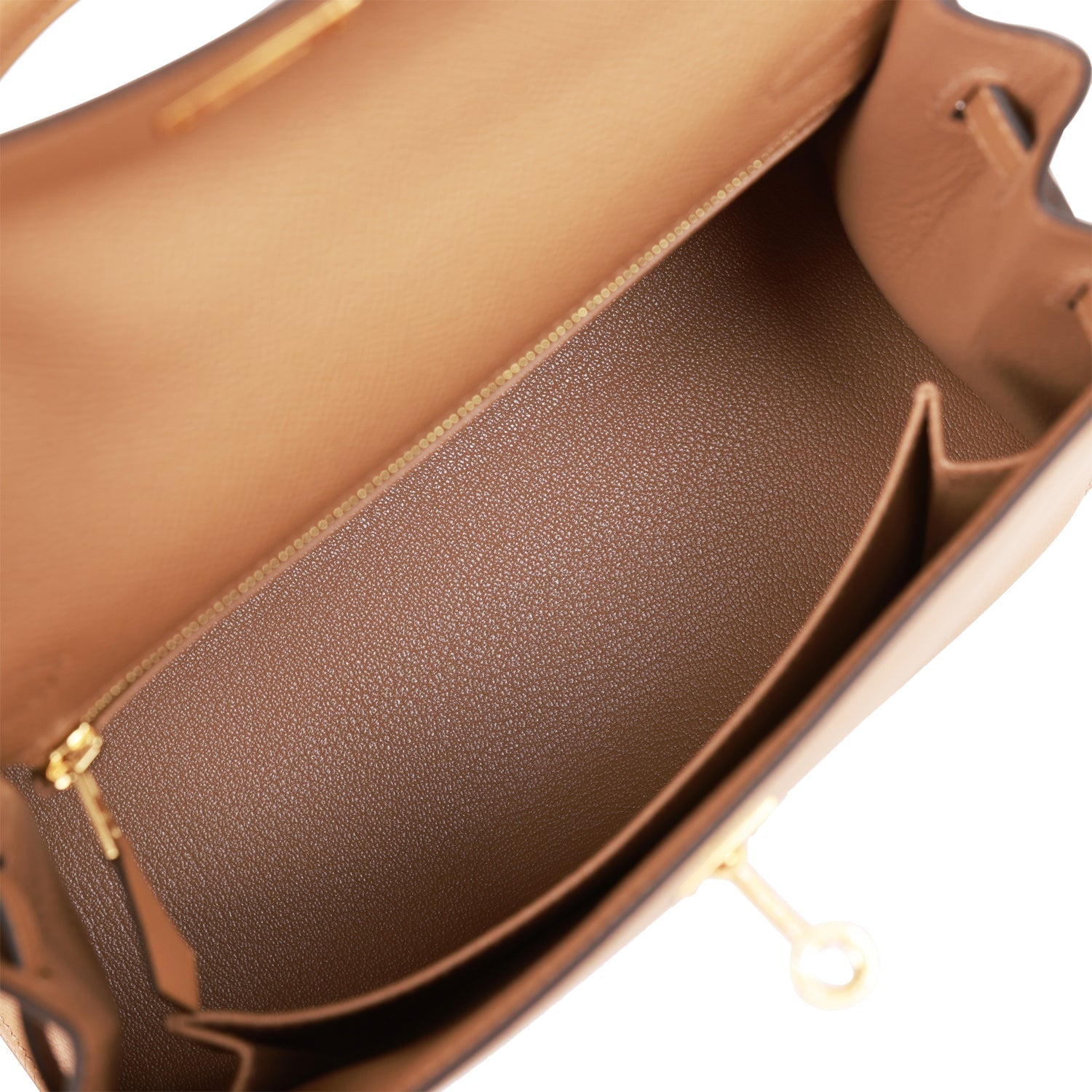 The interior is lined with Chai chevre leather and has one zip pocket with an Hermes engraved pull and one open pocket on the opposite side.