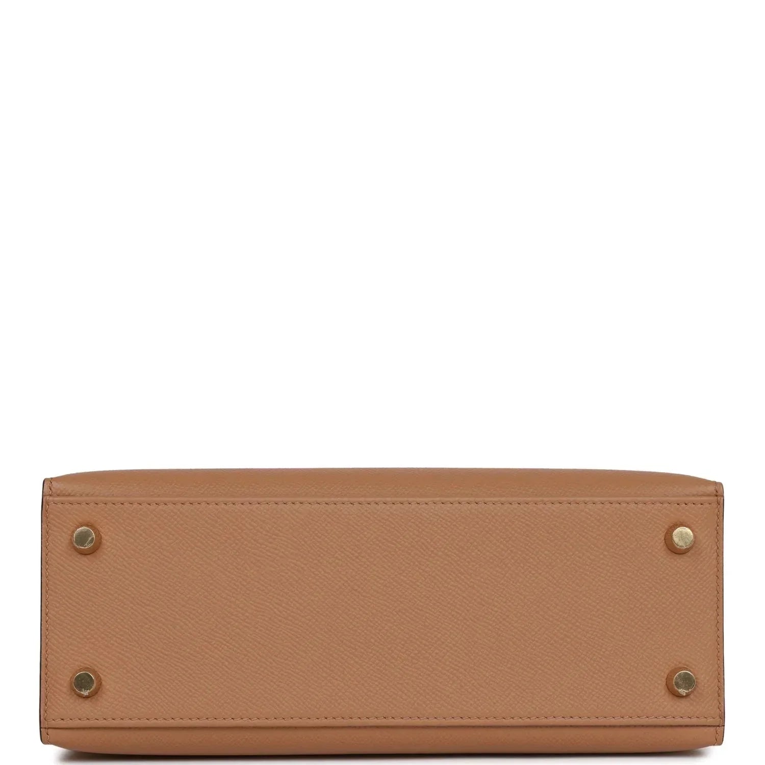 This Kelly, in the Sellier style, is in Chai epsom leather with gold hardware and has tonal stitching, front flap, two straps with center toggle closure, clochette with lock and two keys a single rolled handle and removable shoulder strap.