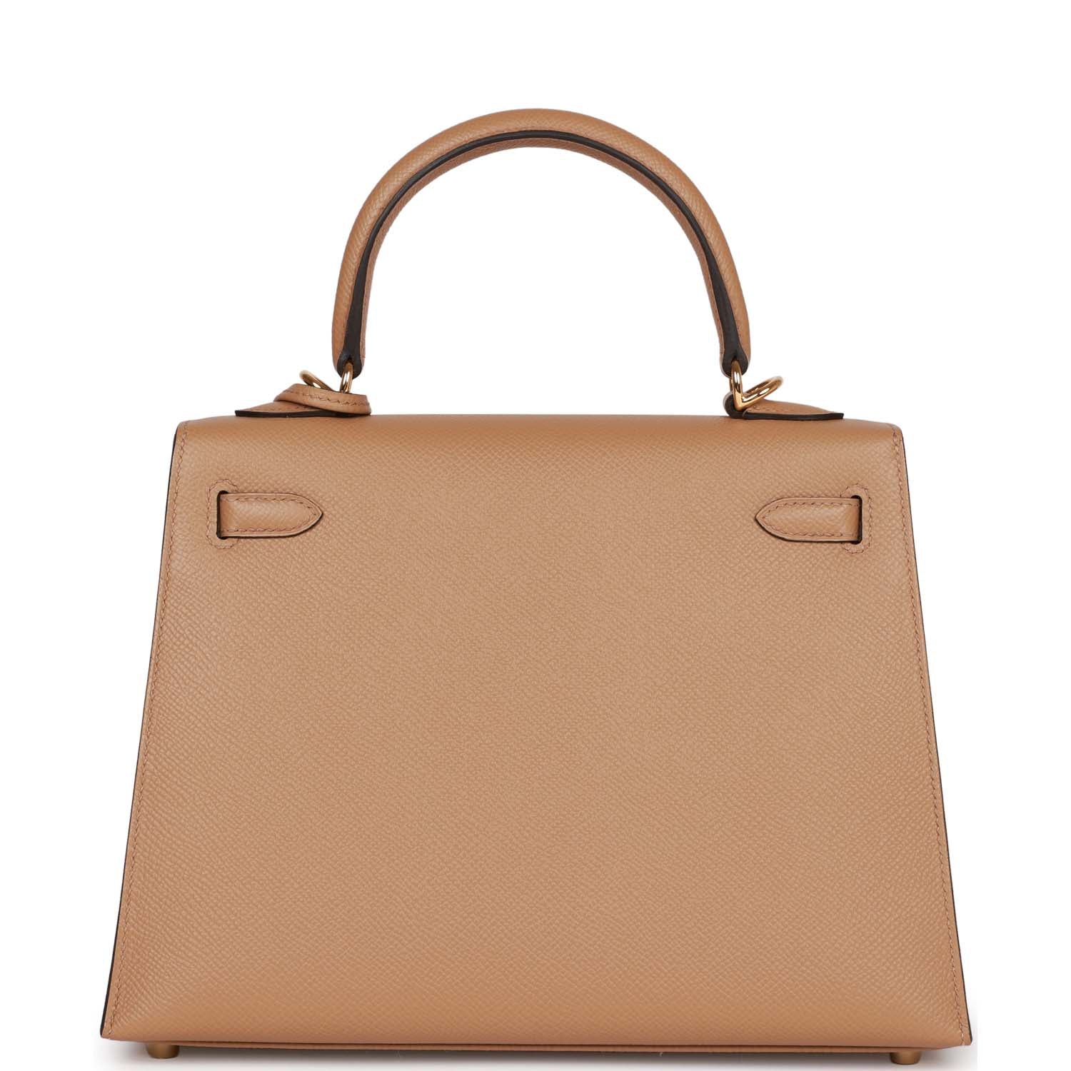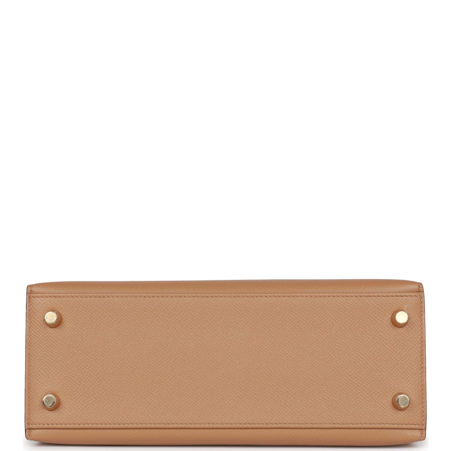 This Kelly, in the Sellier style, is in Chai epsom leather with gold hardware and has tonal stitching, front flap, two straps with center toggle closure, clochette with lock and two keys a single rolled handle and removable shoulder strap.