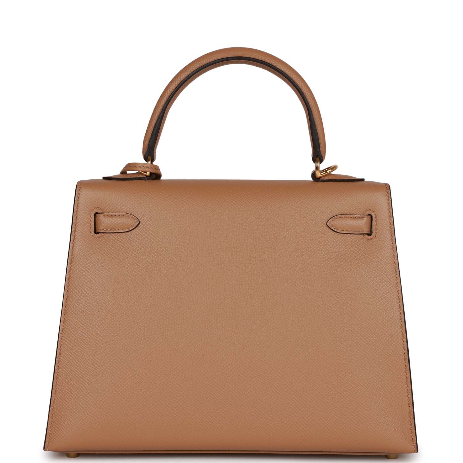 This Kelly, in the Sellier style, is in Chai epsom leather with gold hardware and has tonal stitching, front flap, two straps with center toggle closure, clochette with lock and two keys a single rolled handle and removable shoulder strap.