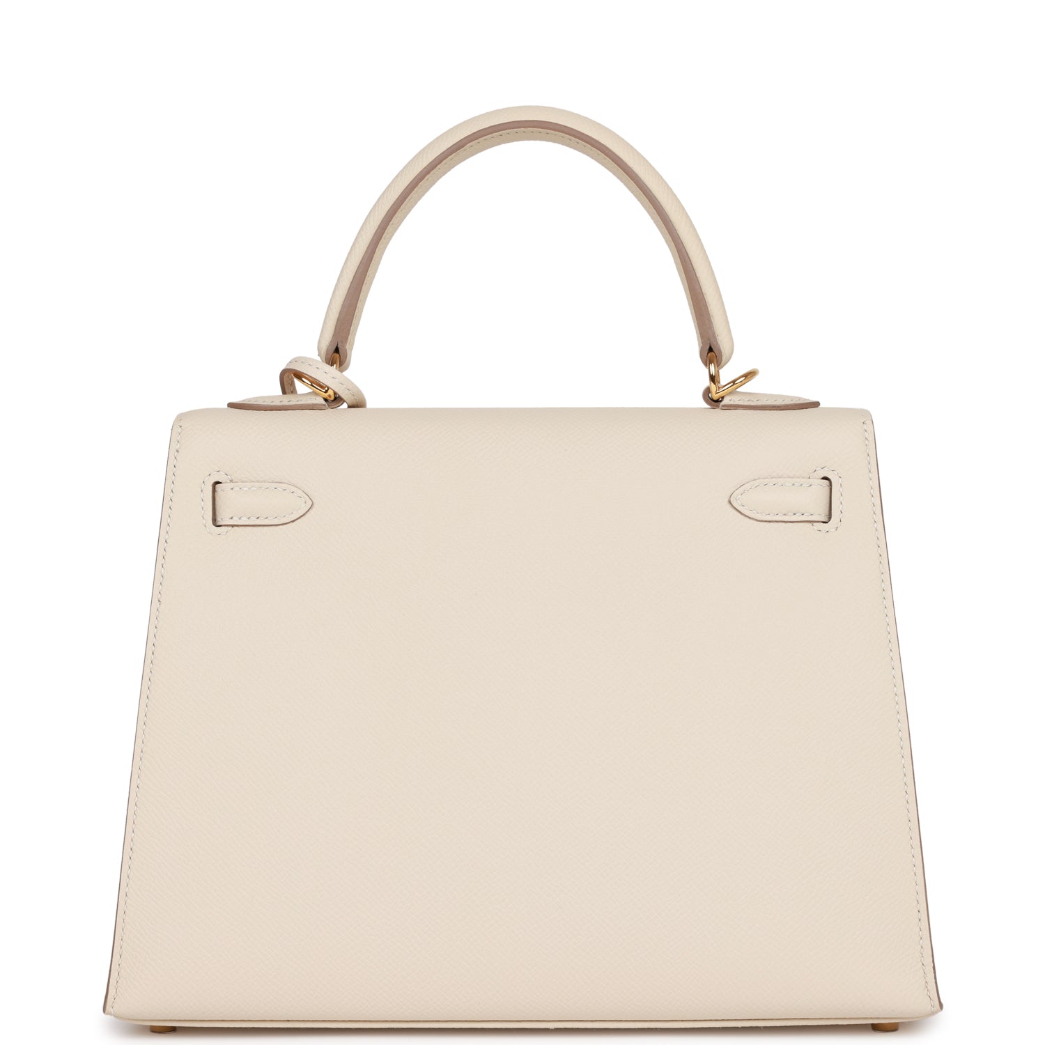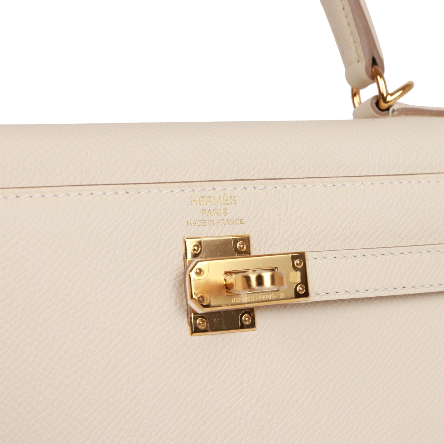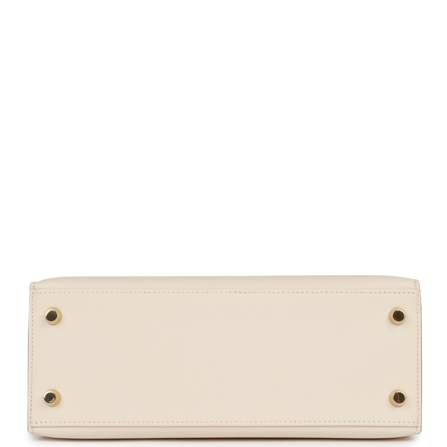 This Kelly, in the Sellier style, is in Craie epsom leather with gold hardware and has tonal stitching, front flap, two straps with center toggle closure, clochette with lock and two keys, single rolled handle and removable shoulder strap.