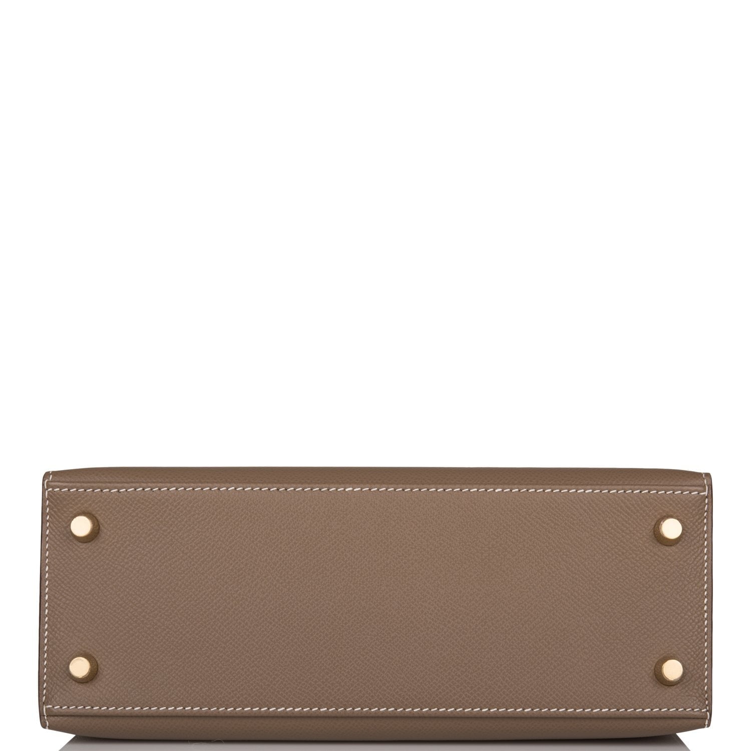 This Kelly, in the Sellier style, is in Etoupe epsom leather with gold hardware and has contrast stitching, front flap, two straps with center toggle closure, clochette with lock and two keys a single rolled handle and removable shoulder strap.