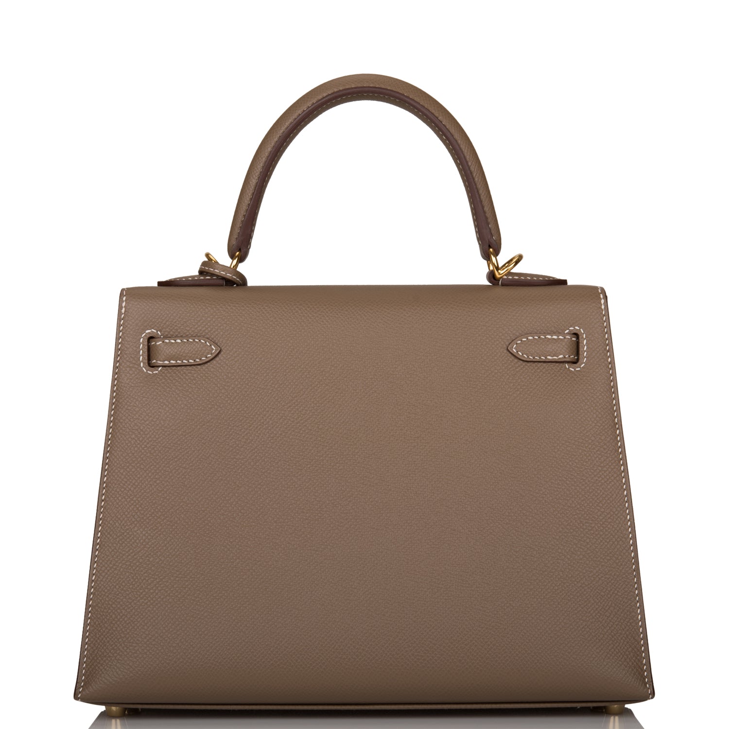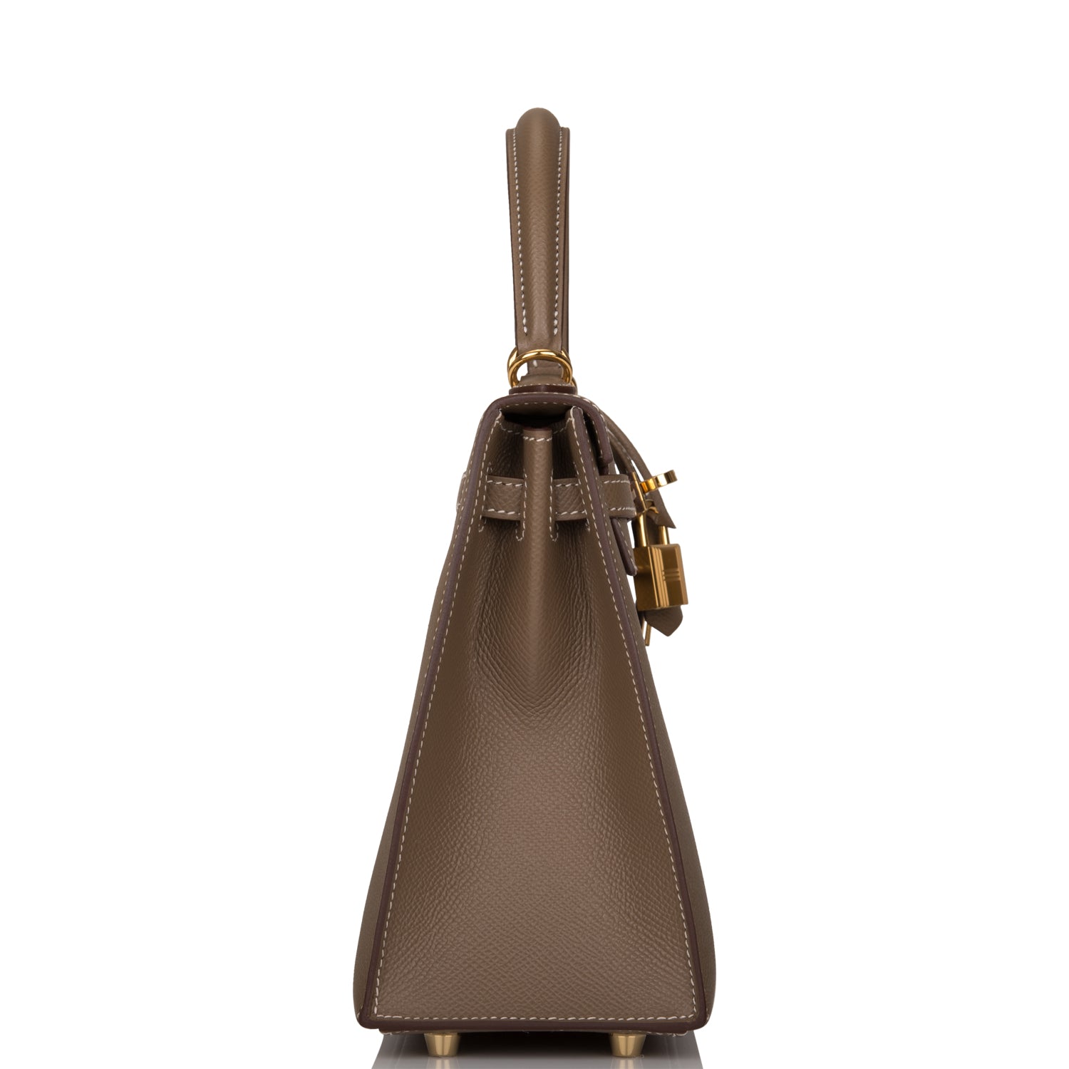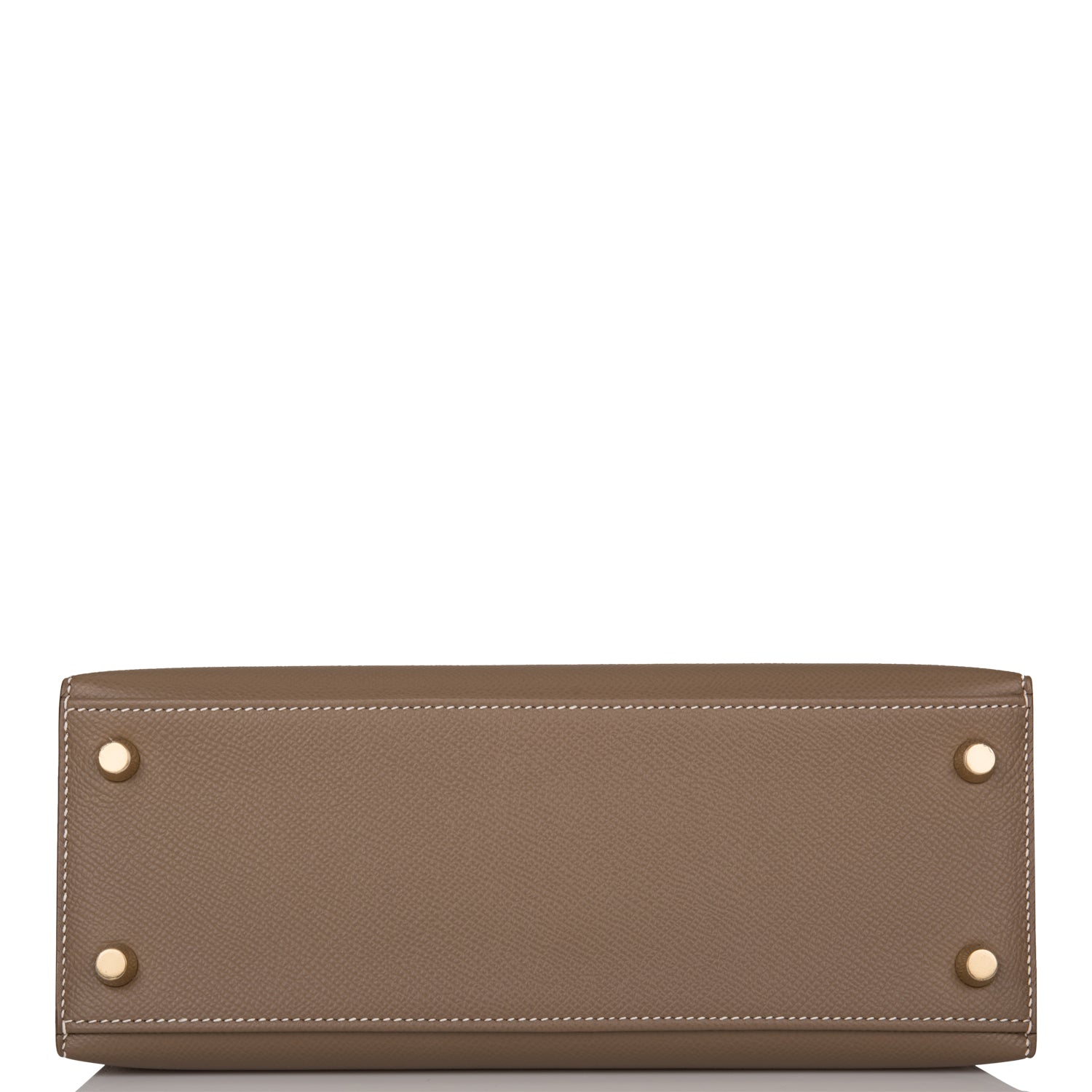 This Kelly, in the Sellier style, is in Etoupe epsom leather with gold hardware and has contrast stitching, front flap, two straps with center toggle closure, clochette with lock and two keys a single rolled handle and removable shoulder strap.