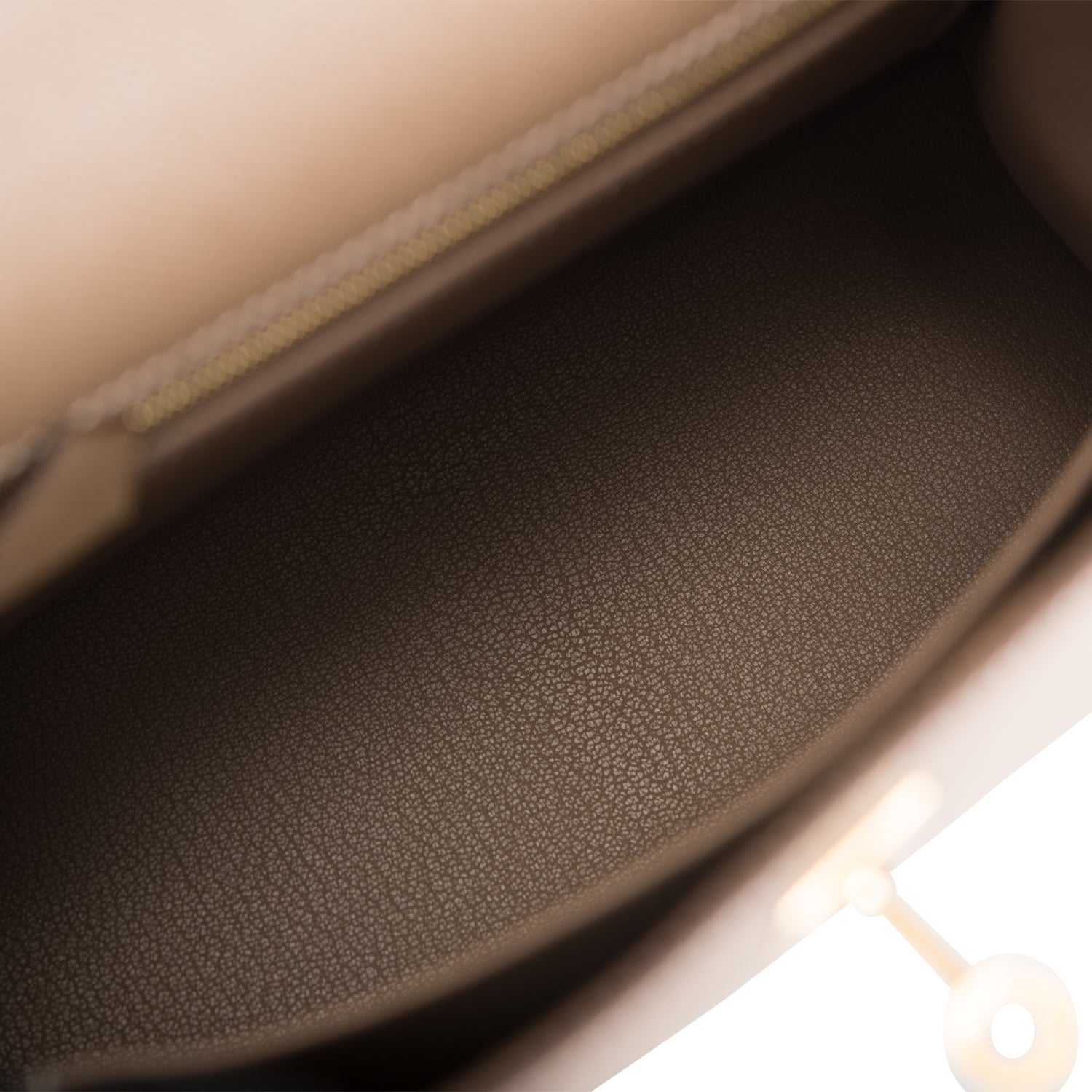 The interior is lined with Etoupe chevre leather and has one zip pocket with an Hermes engraved pull and one open pocket on the opposite side.