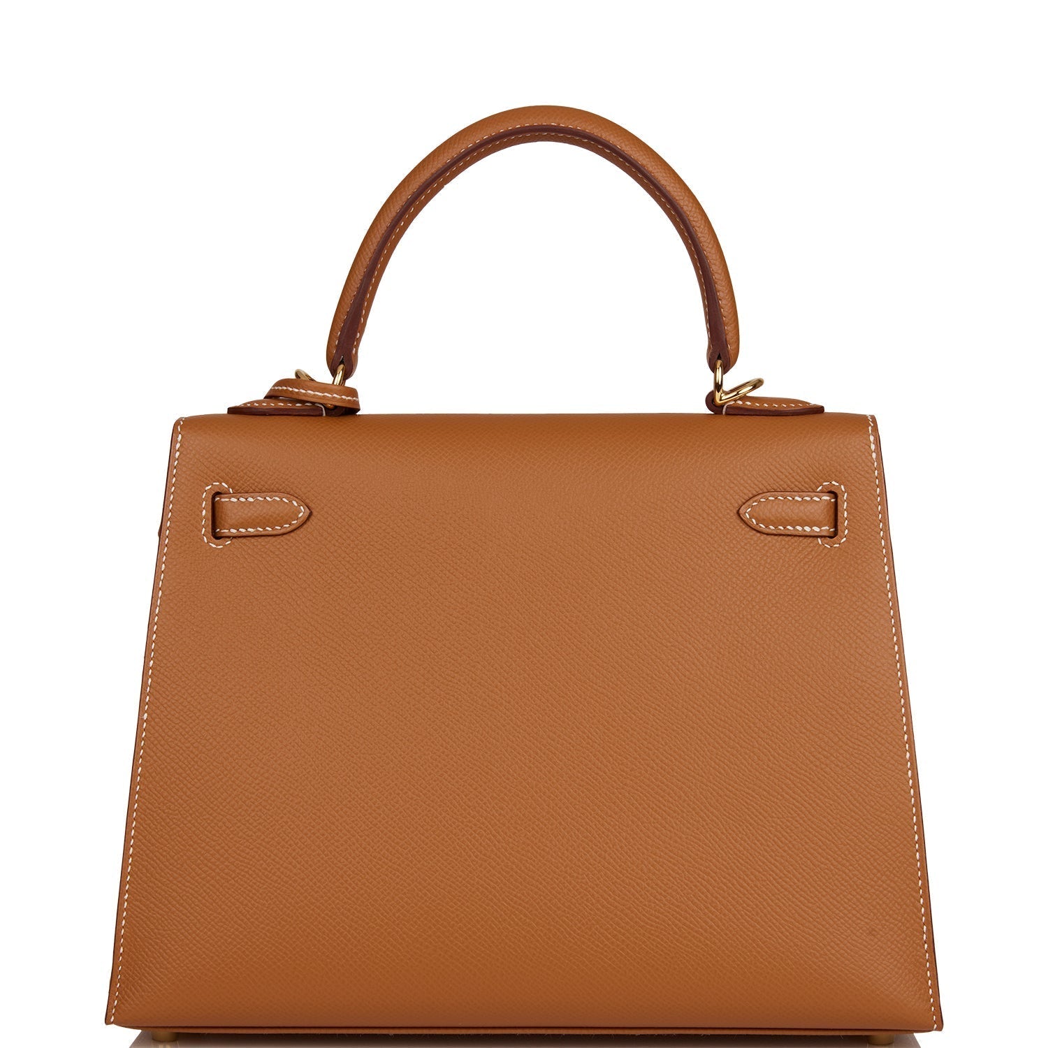 This Kelly, in the Sellier style, is in gold epsom leather with gold hardware and has contrast stitching, front flap, two straps with center toggle closure, clochette with lock and two keys a single rolled handle and removable shoulder strap.
