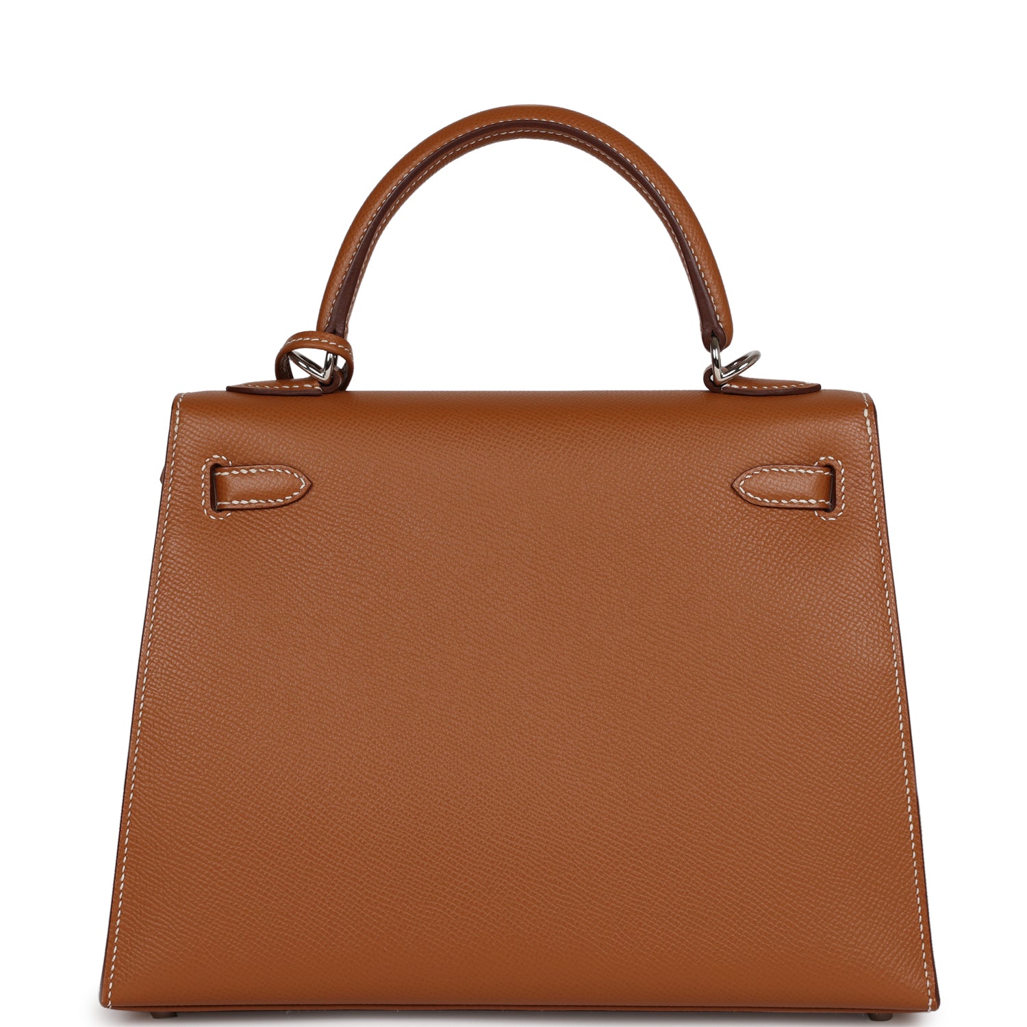 This Kelly, in the Sellier style, is in gold epsom leather with palladium hardware and has contrast stitching, front flap, two straps with center toggle closure, clochette with lock and two keys a single rolled handle and removable shoulder strap.