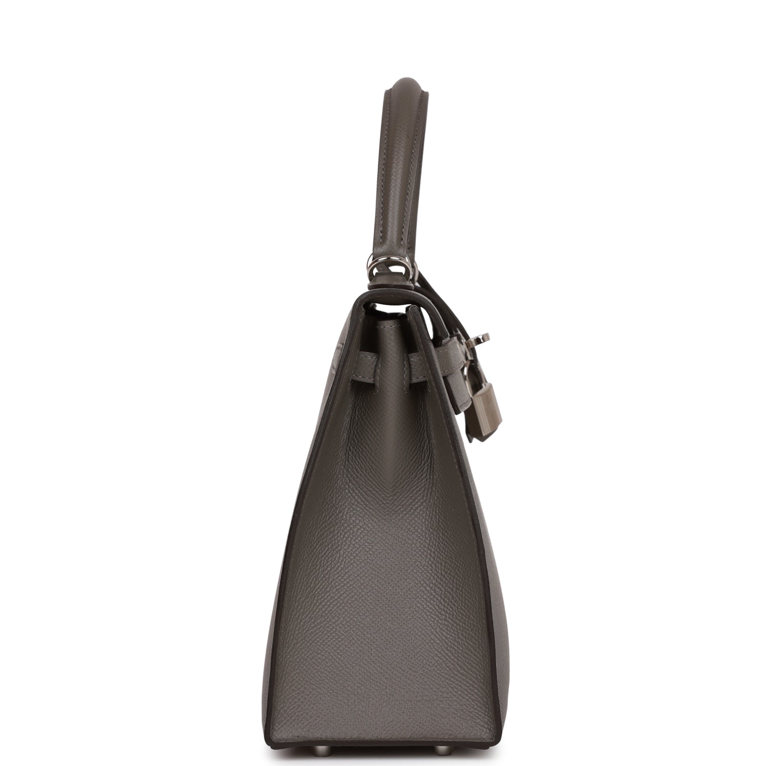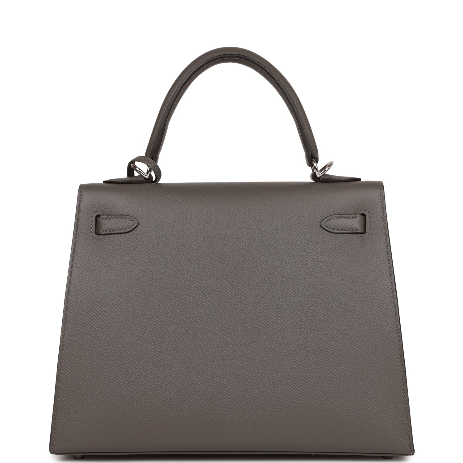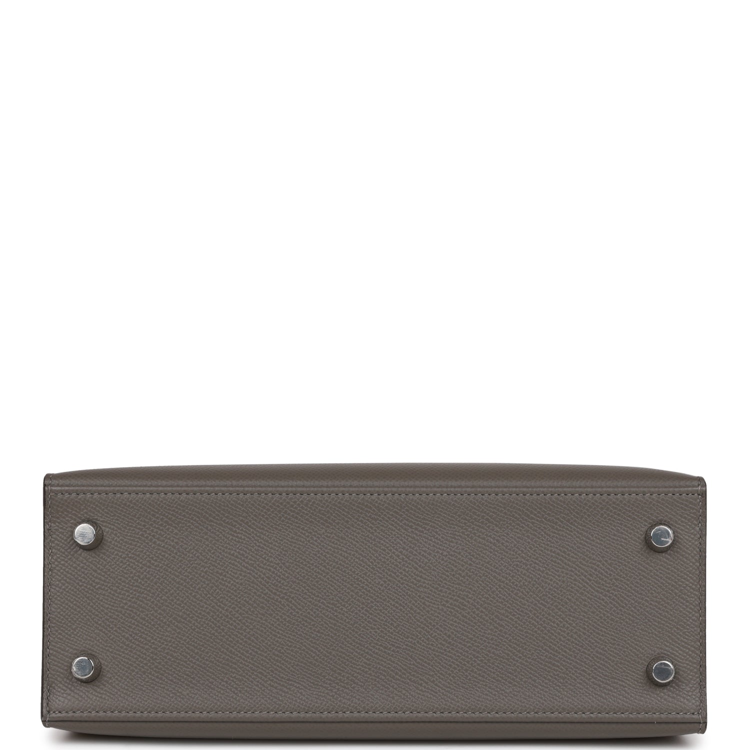 This Kelly, in the Sellier style, is in Gris Meyer epsom leather with palladium hardware and has tonal stitching, two straps with front toggle closure, clochette with lock and two keys, a single rolled handle and removable shoulder strap.