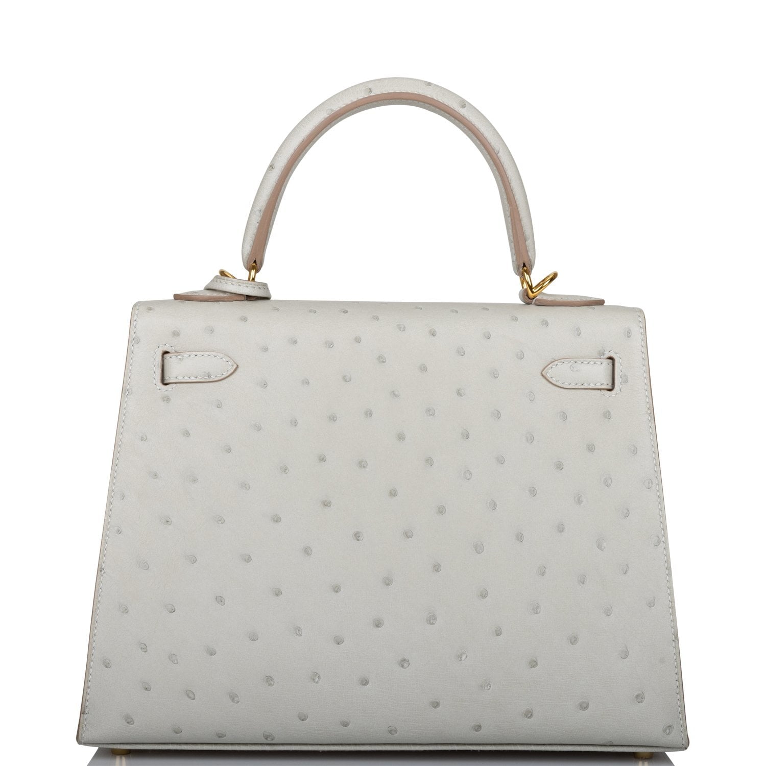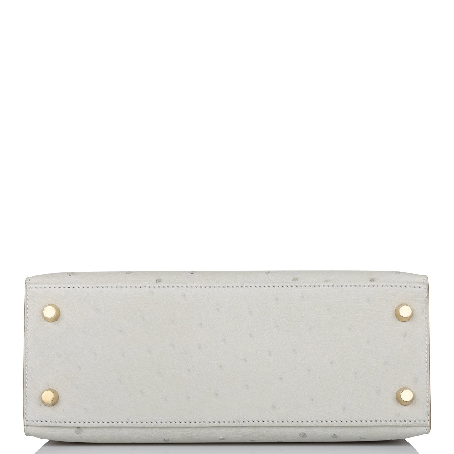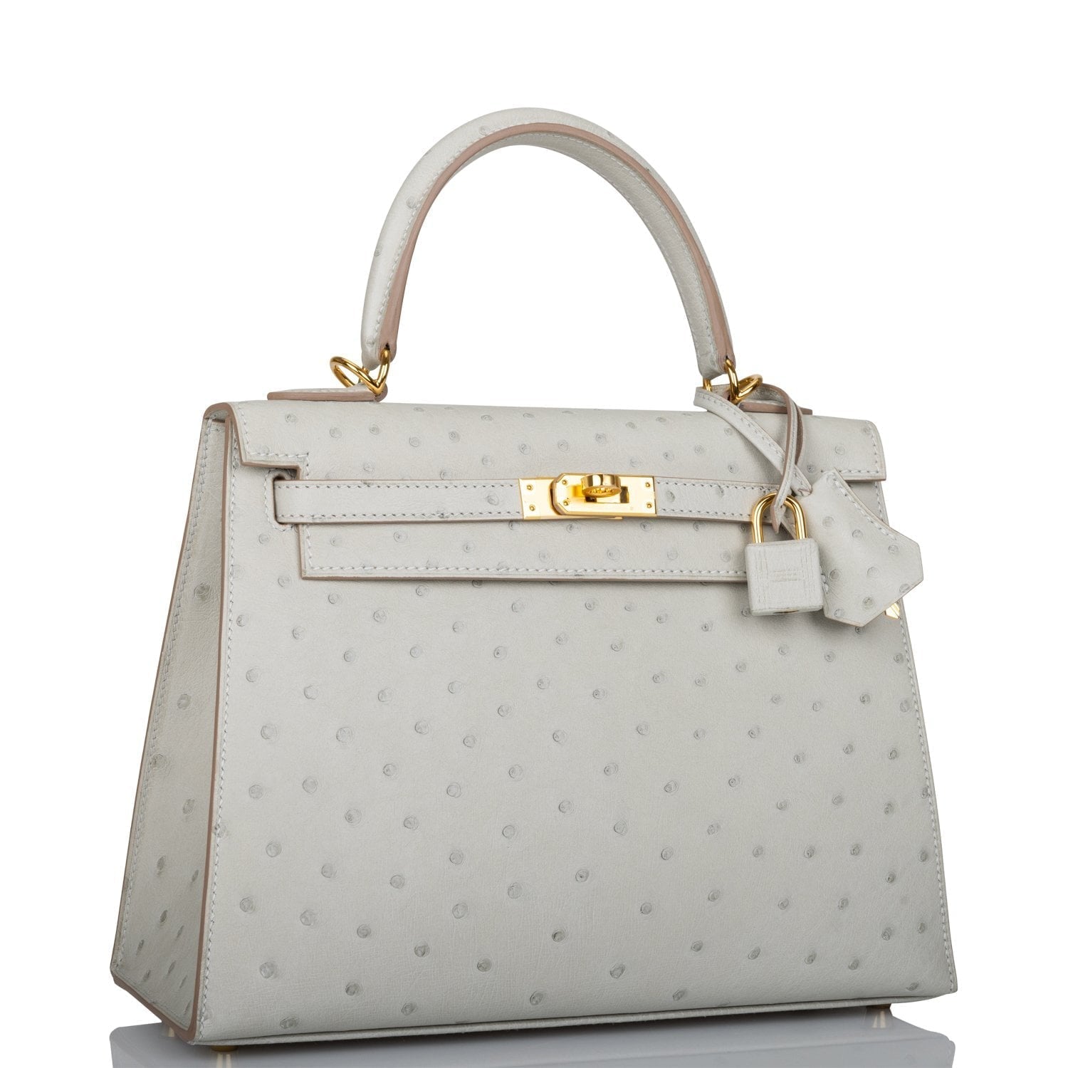This Kelly, in the Sellier style, is in Gris Perle Ostrich with gold hardware and has tonal stitching, two straps with front toggle closure, clochette with lock and two keys, single rolled handle and removable shoulder strap.