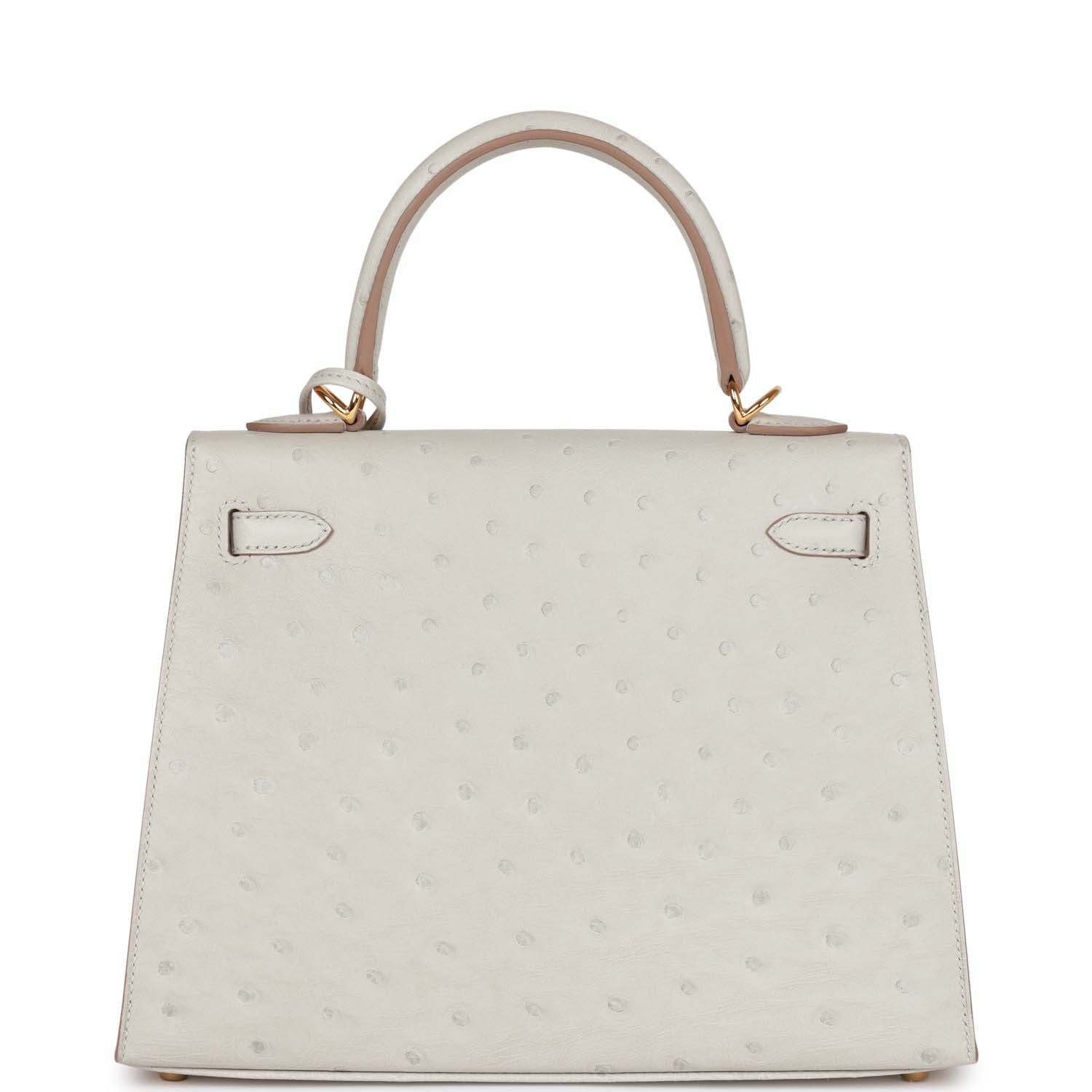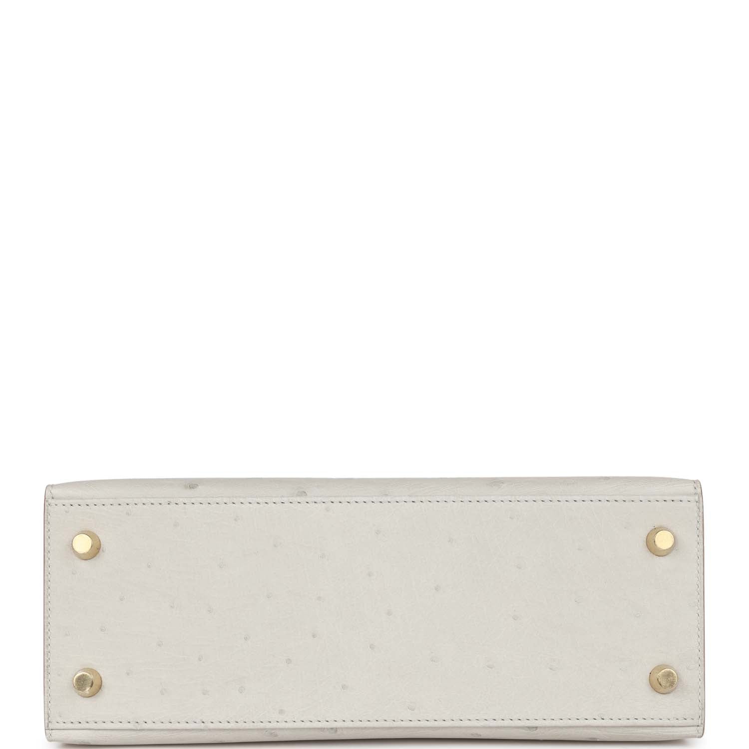 This Kelly, in the Sellier style, is in Gris Perle Ostrich with gold hardware and has tonal stitching, two straps with front toggle closure, clochette with lock and two keys, single rolled handle and removable shoulder strap.