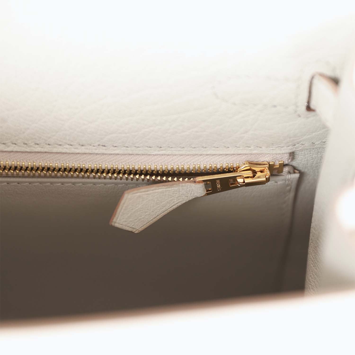The interior is lined with Gris Perle chevre and has a zipper pocket with an Hermes engraved pull and one pocket on the opposite side.
