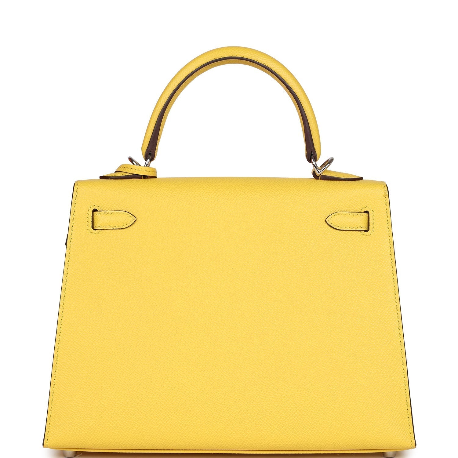 This Kelly, in the Sellier style, is in Jaune De Naples epsom leather with palladium hardware and has tonal stitching, two straps with front toggle closure, clochette with lock and two keys, single rolled handle and removable shoulder strap.