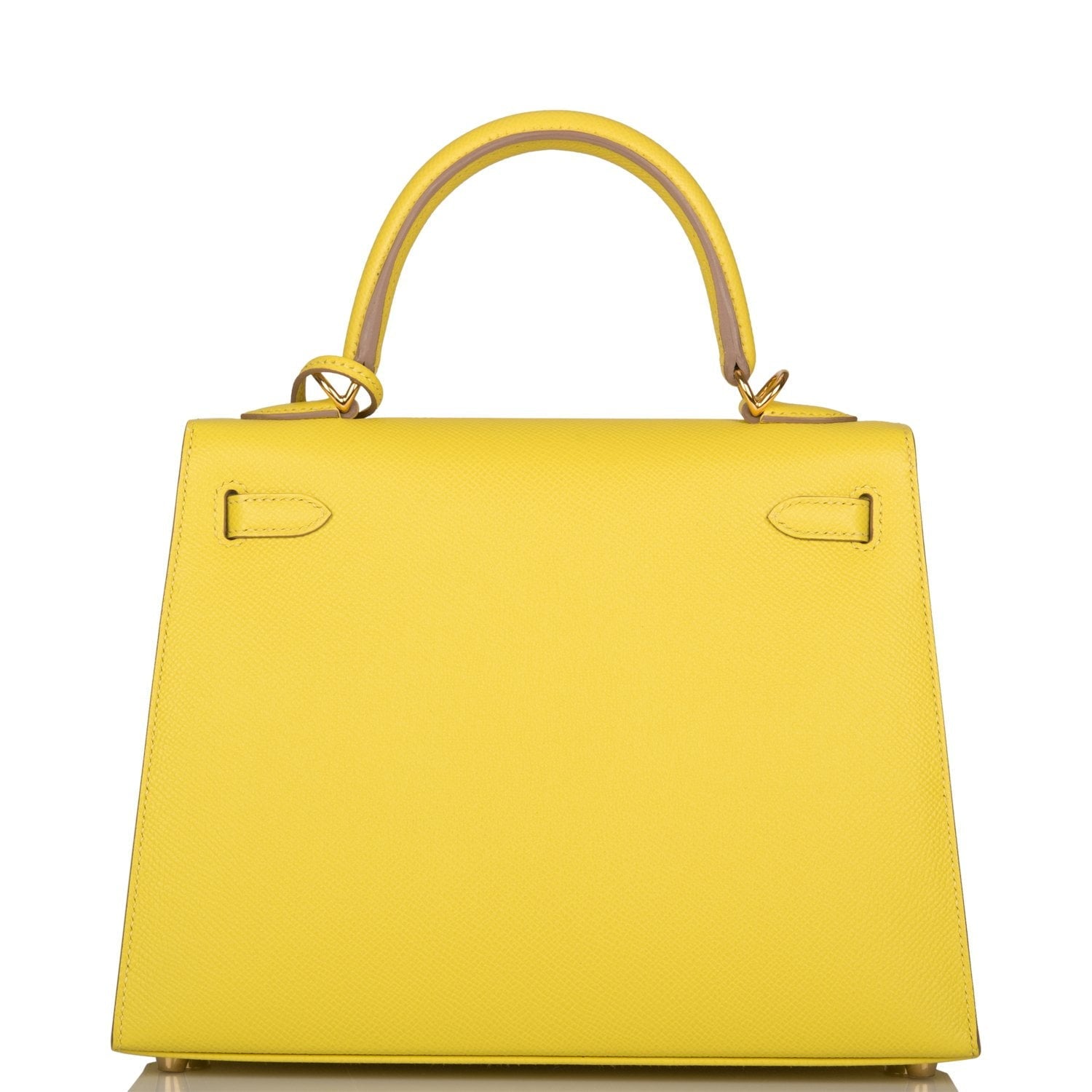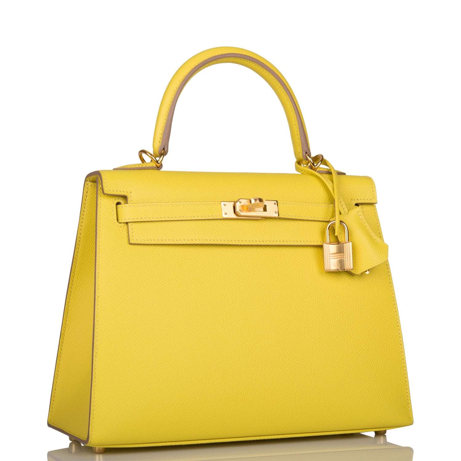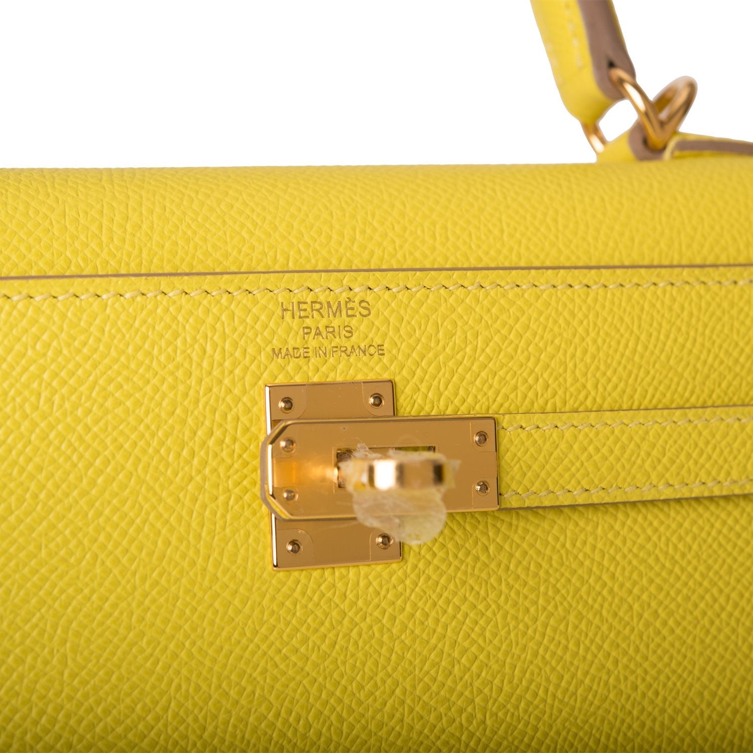 This Kelly, in the Sellier style, is in Lime epsom leather with gold hardware has tonal stitching, front flap, two straps with center toggle closure, clochette with lock and two keys, single rolled handle and removable shoulder strap.