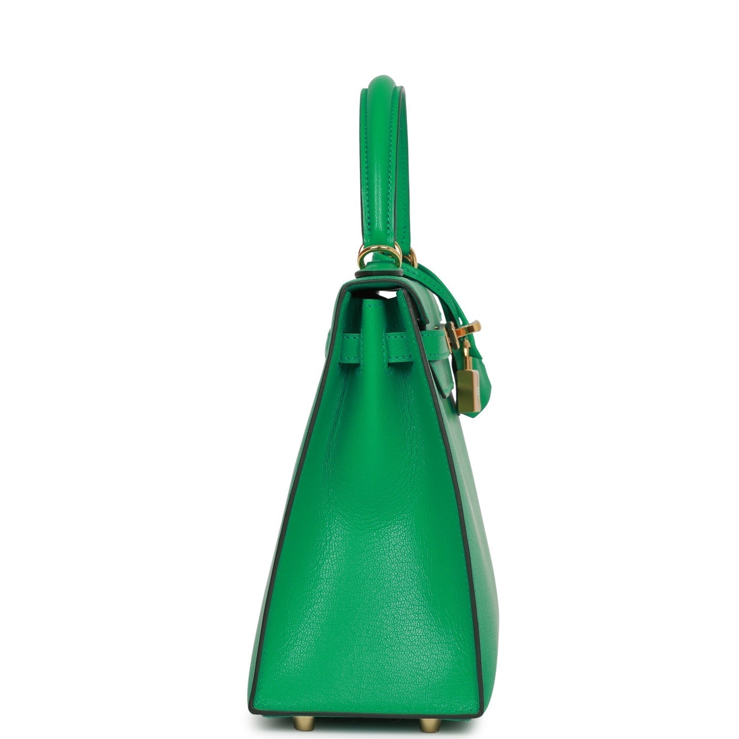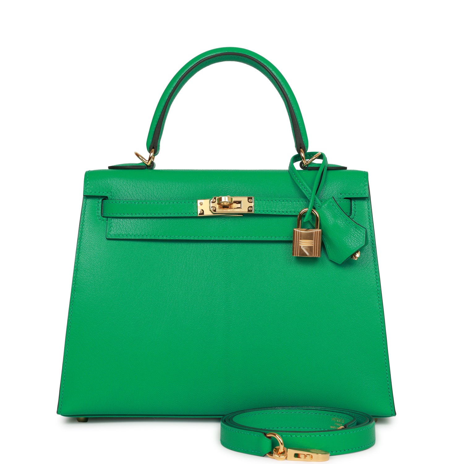 This Kelly, in the Sellier style, is in Menthe chevre leather with gold hardware and has tonal stitching, two straps with front toggle closure, clochette with lock and two keys, single rolled handle and removable shoulder strap.