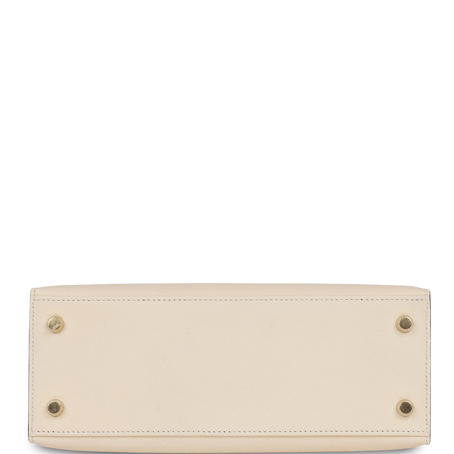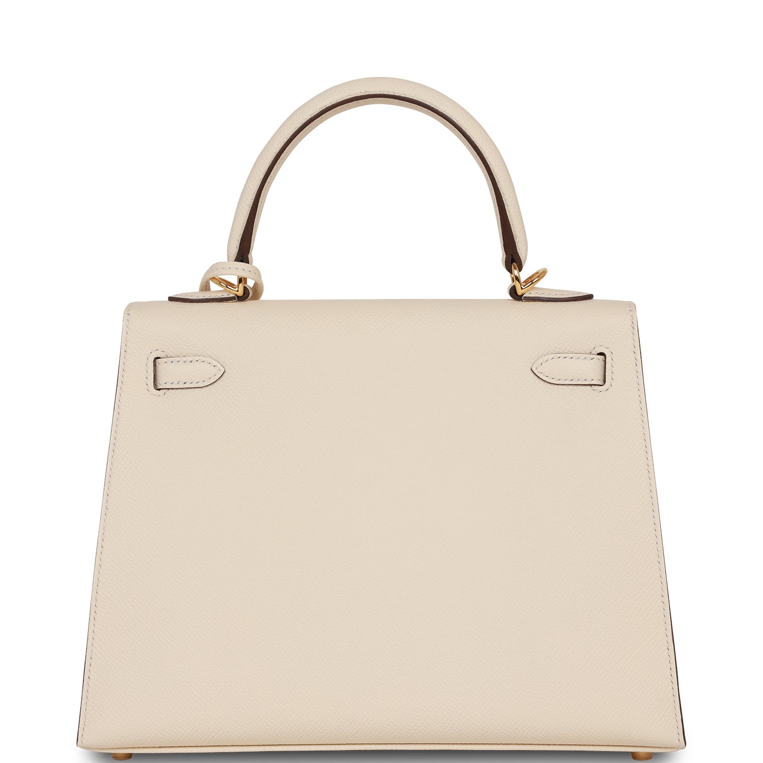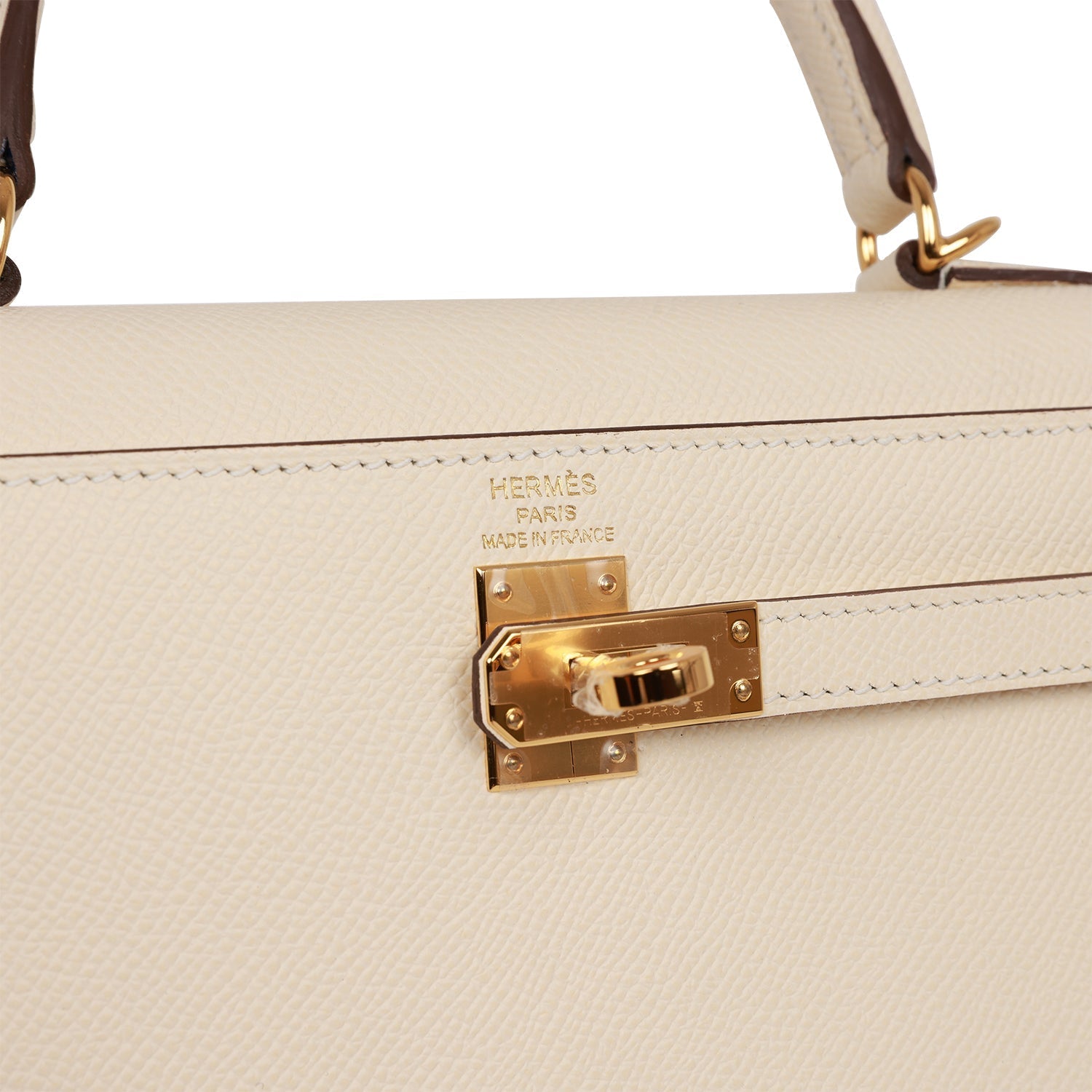 This Kelly, in the Sellier style, is in Nata epsom leather with gold hardware and has tonal stitching, front flap, two straps with center toggle closure, clochette with lock and two keys, single rolled handle and removable shoulder strap.
