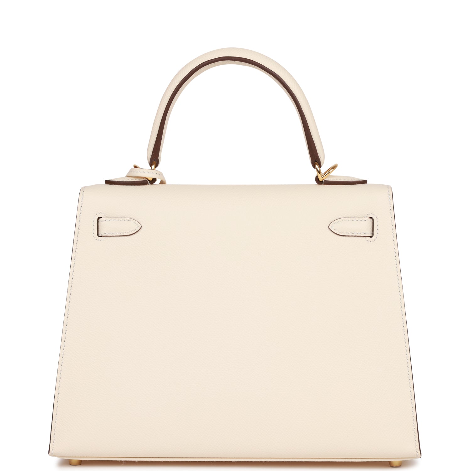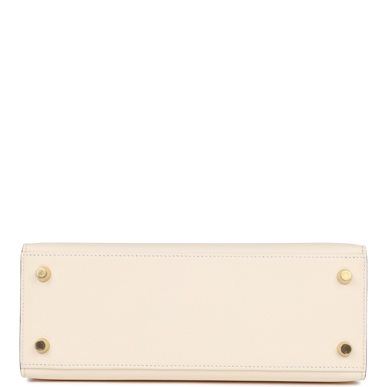 This Kelly, in the Sellier style, is in Nata epsom leather with gold hardware and has tonal stitching, front flap, two straps with center toggle closure, clochette with lock and two keys, single rolled handle and removable shoulder strap.