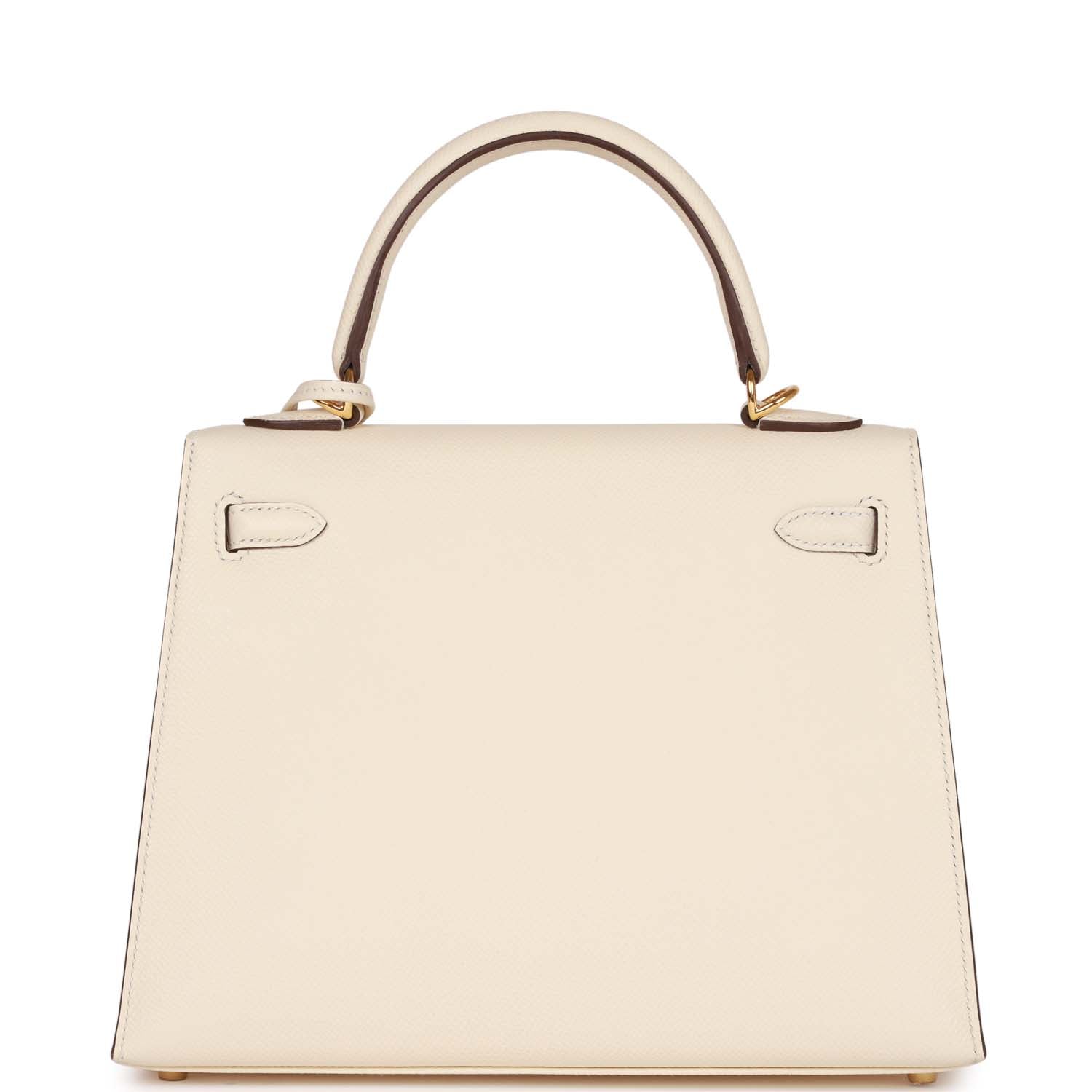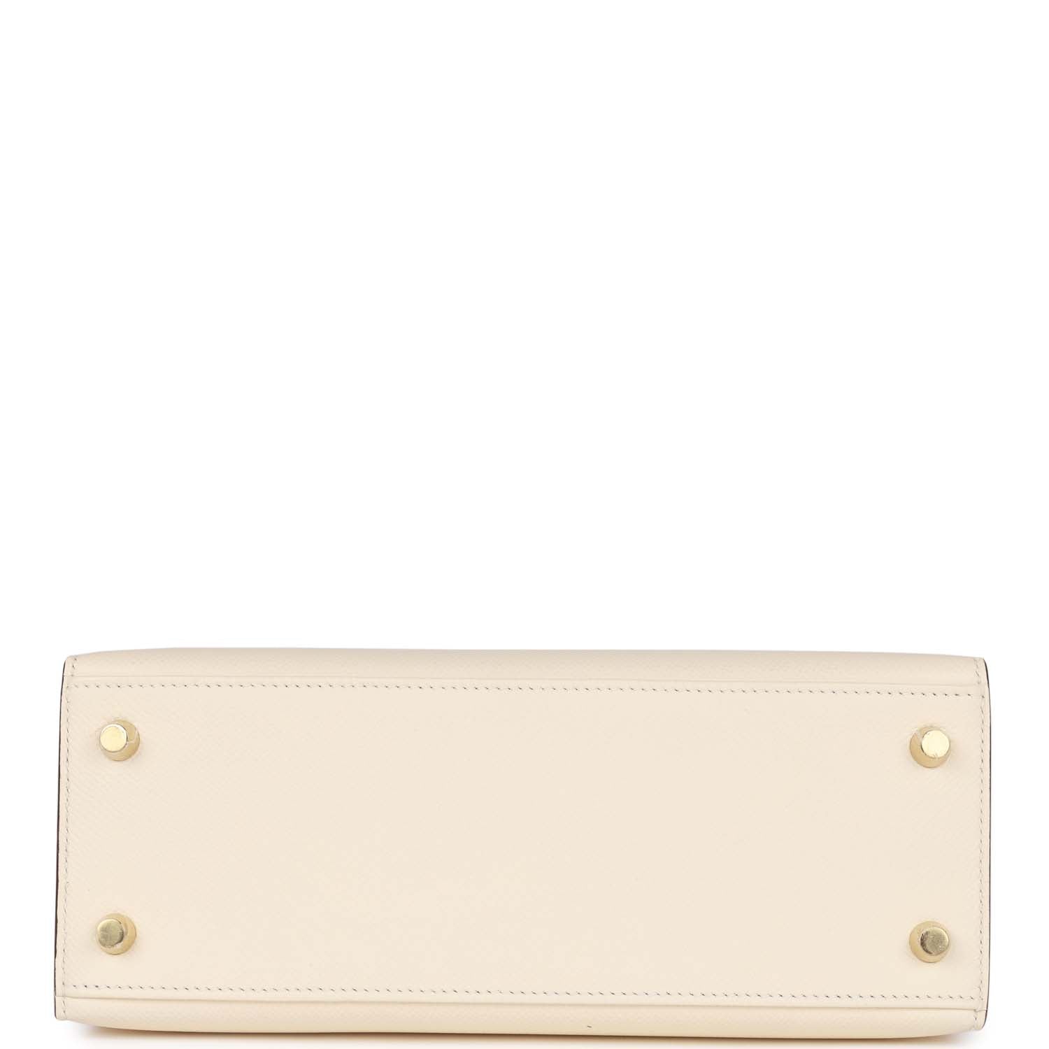 This Kelly, in the Sellier style, is in Nata epsom leather with gold hardware and has tonal stitching, front flap, two straps with center toggle closure, clochette with lock and two keys, single rolled handle and removable shoulder strap.