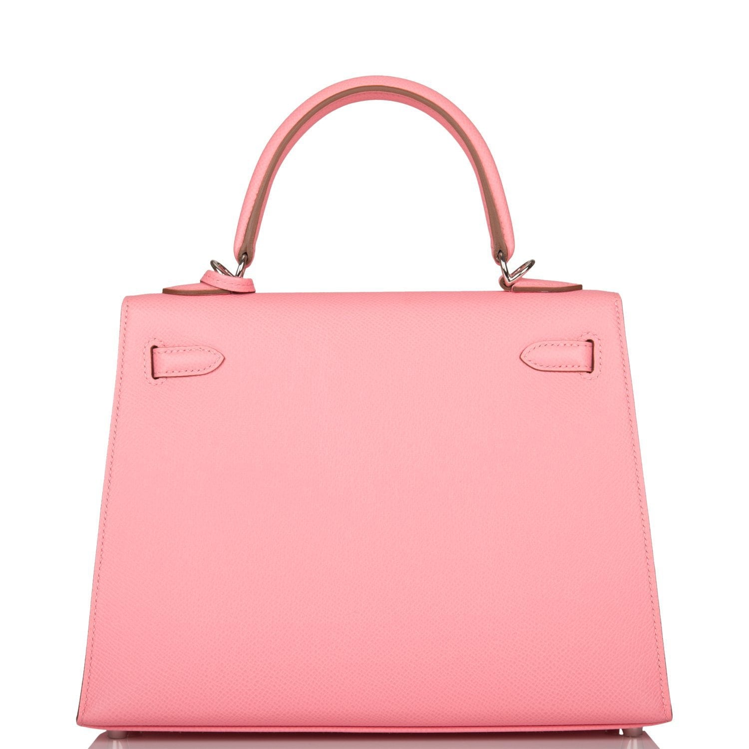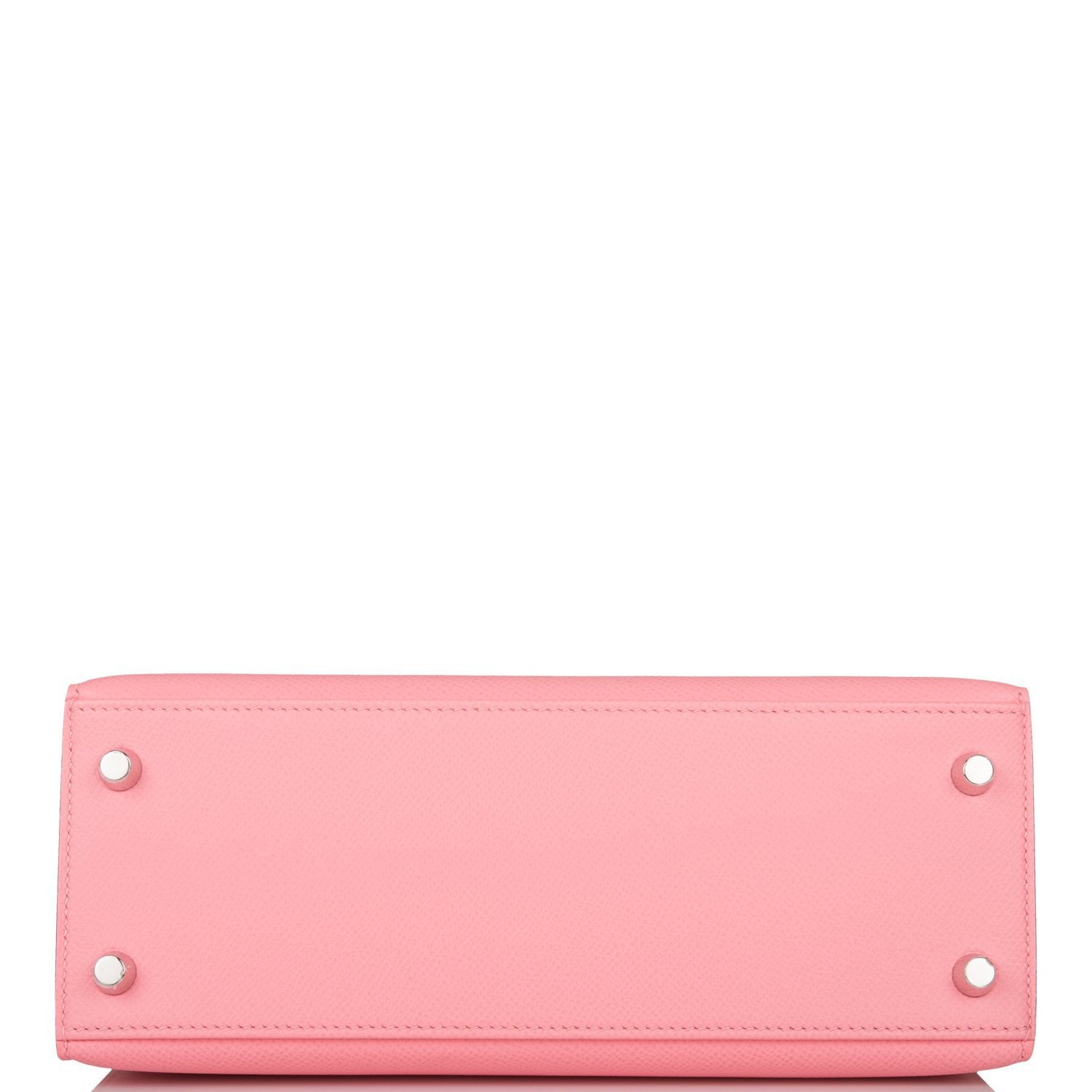 This Kelly, in the Sellier style, is in Rose Confetti epsom leather with palladium hardware and has tonal stitching, two front straps with toggle closure, clochette with lock and two keys, single rolled handle and removable shoulder strap.