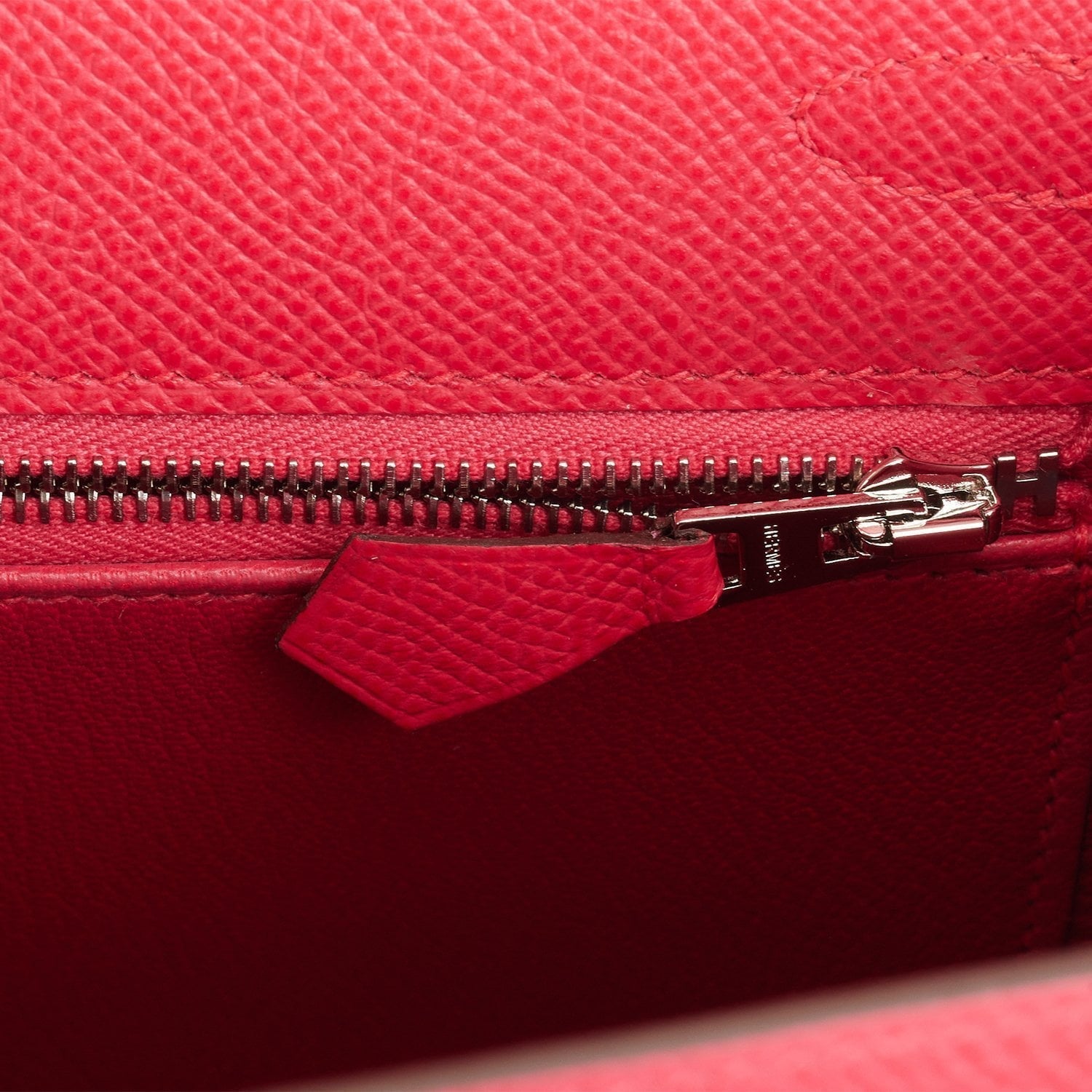 The interior is lined with Rose Extreme chevre leather and has one zip pocket with an Hermes engraved pull and one open pocket on the opposite side.