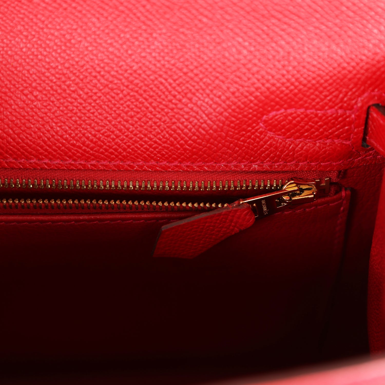 The interior is lined with Rouge Casaque chevre leather and has one zip pocket with an Hermes engraved pull and one open pocket on the opposite side.