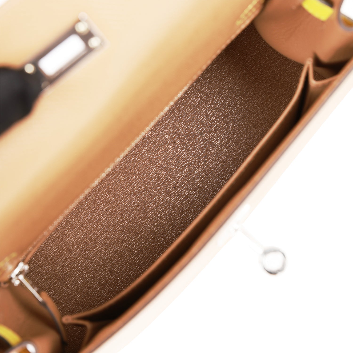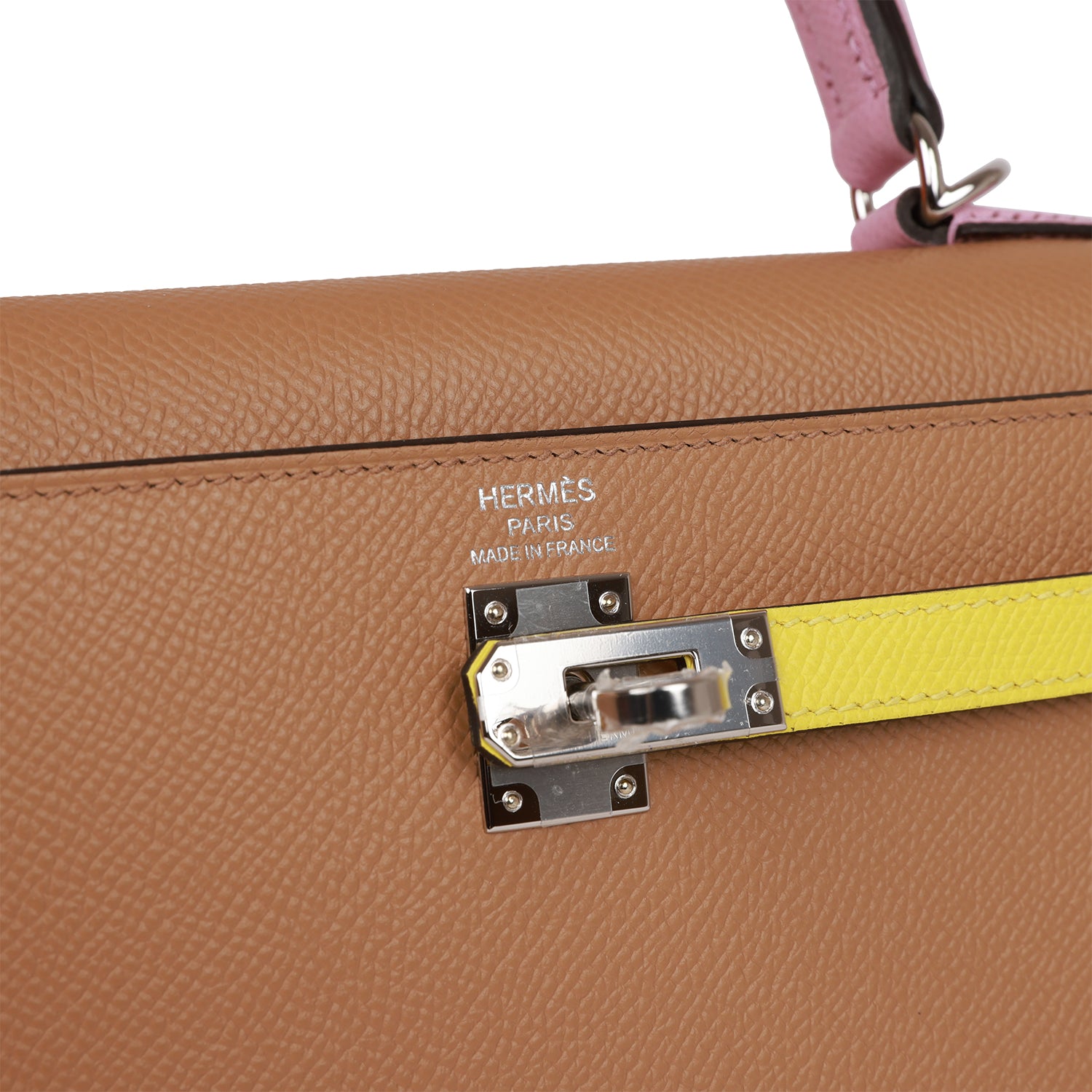 This Tri-Color Kelly, in the Sellier style, is in Chai, Lime and Mauve Sylvestre epsom leather with palladium hardware and has tonal stitching, front flap, two straps with center toggle closure, clochette with lock and two keys, single rolled handle and removable shoulder strap.