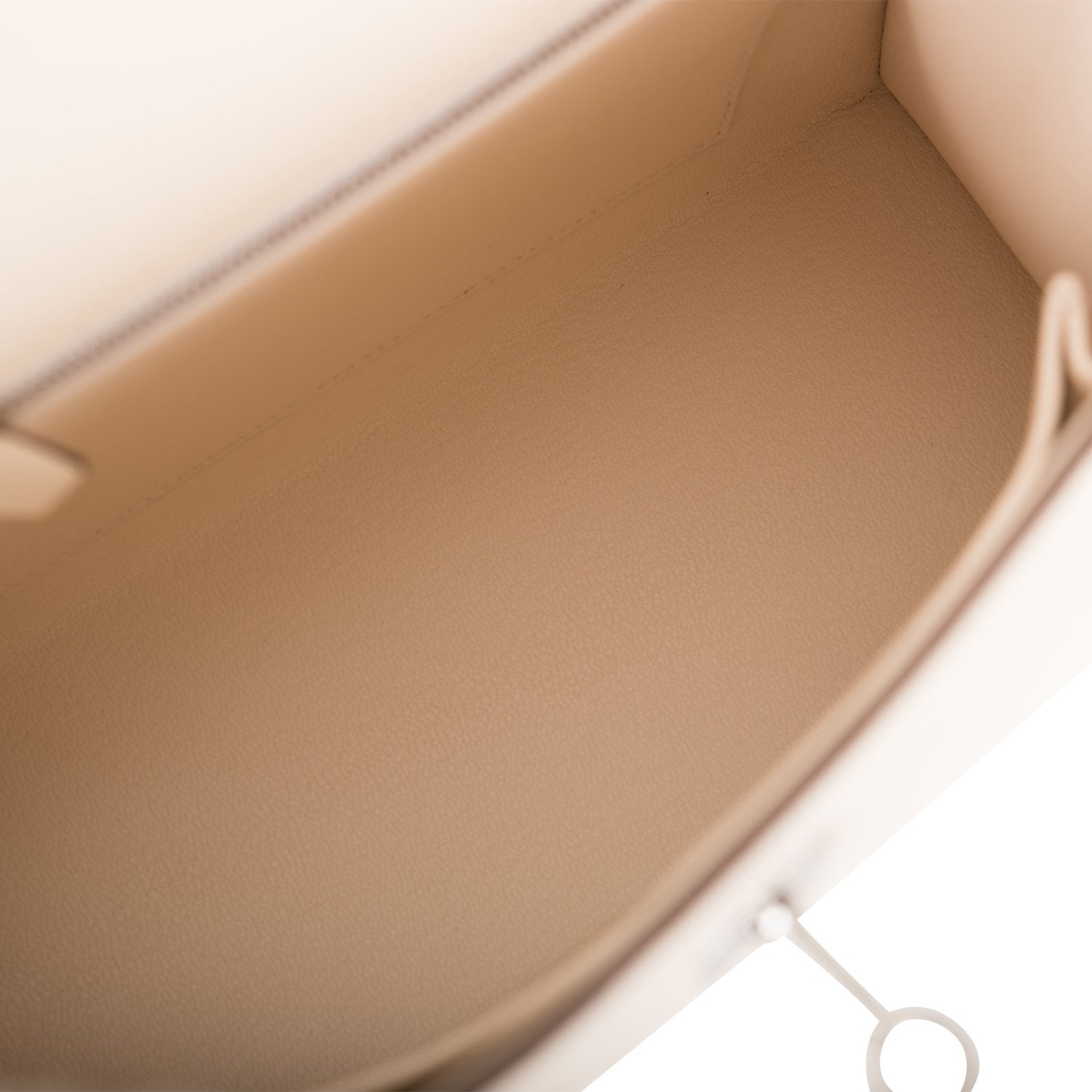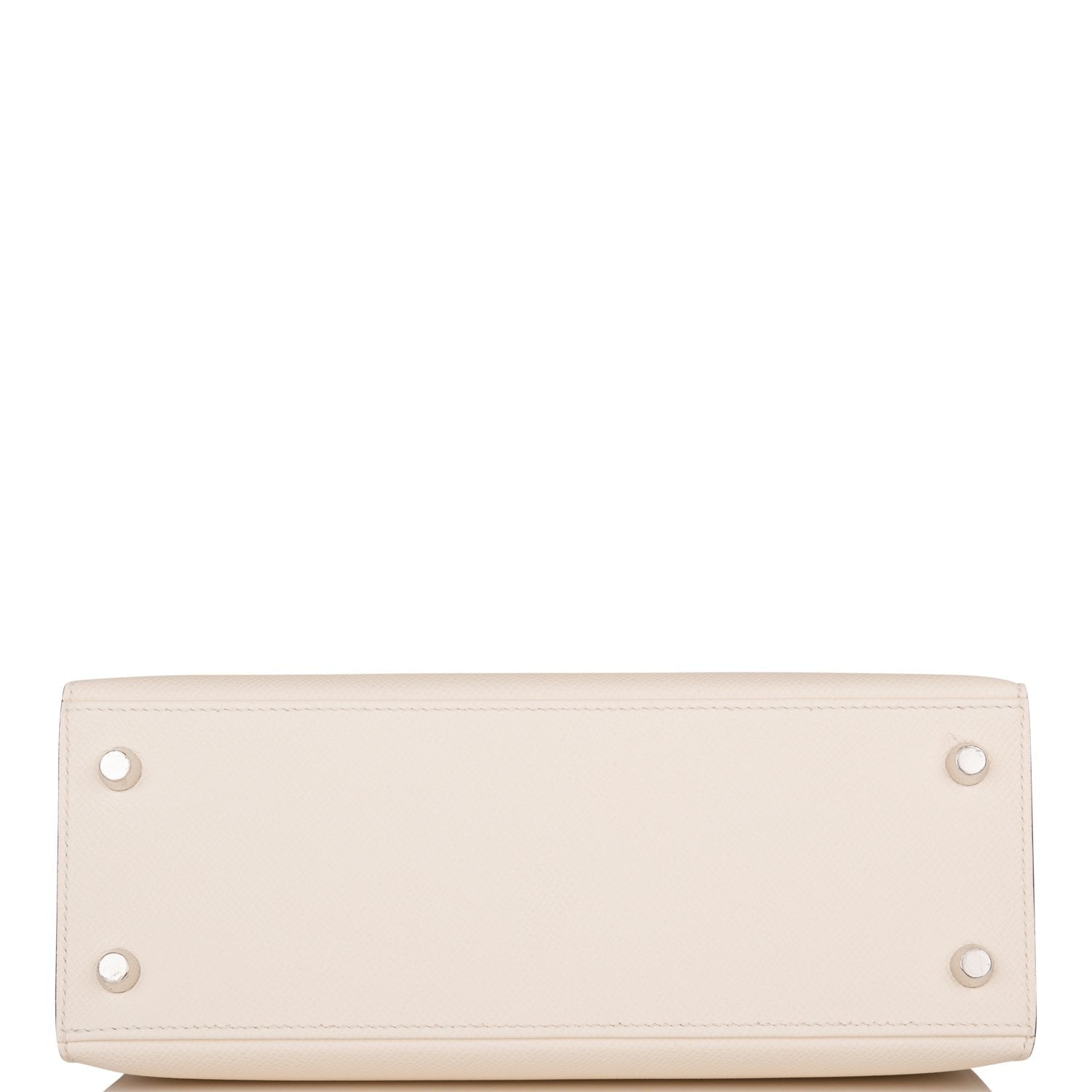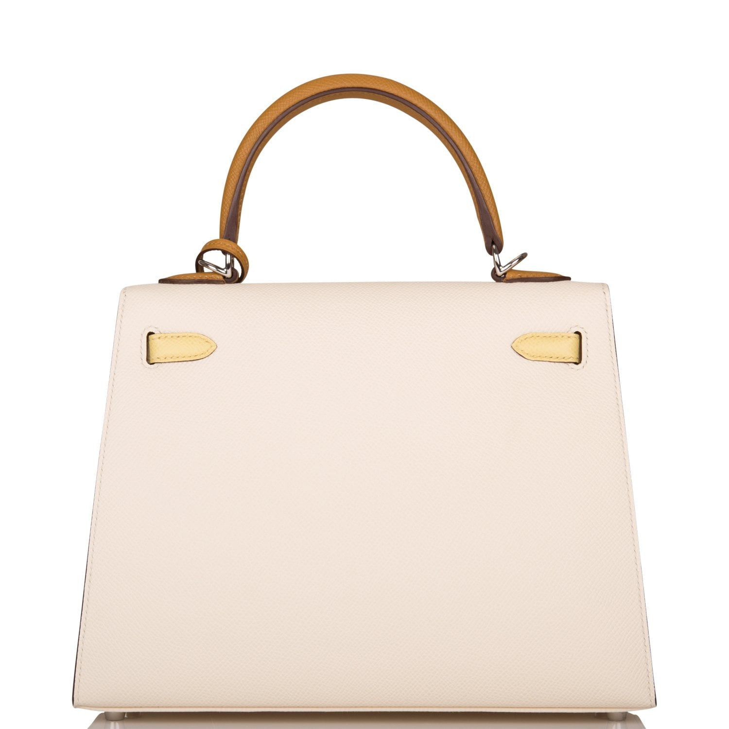 This Tri-Color Kelly, in the Sellier style, is in Nata, Jaune Poussin and Sesame epsom leather with palladium hardware and has tonal stitching, front flap, two straps with center toggle closure, clochette with lock and two keys, single rolled handle and removable shoulder strap.