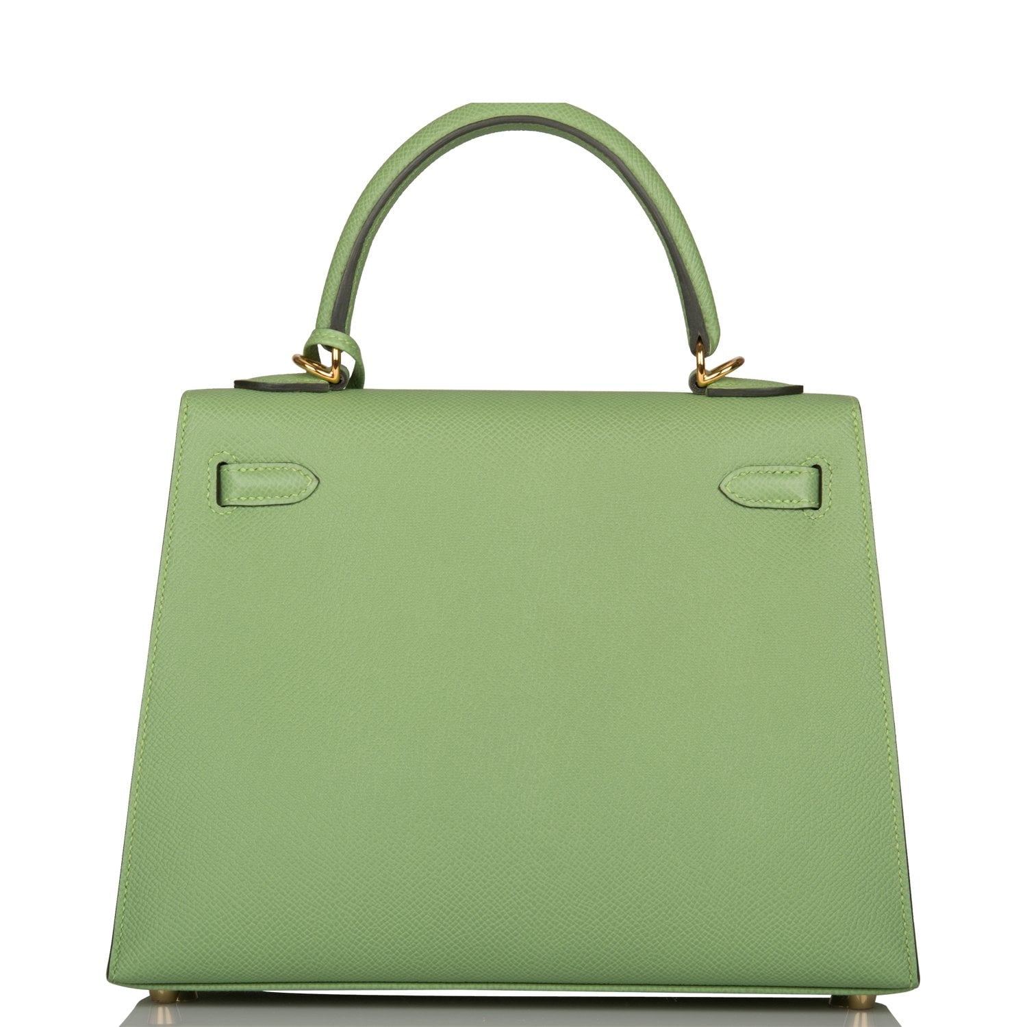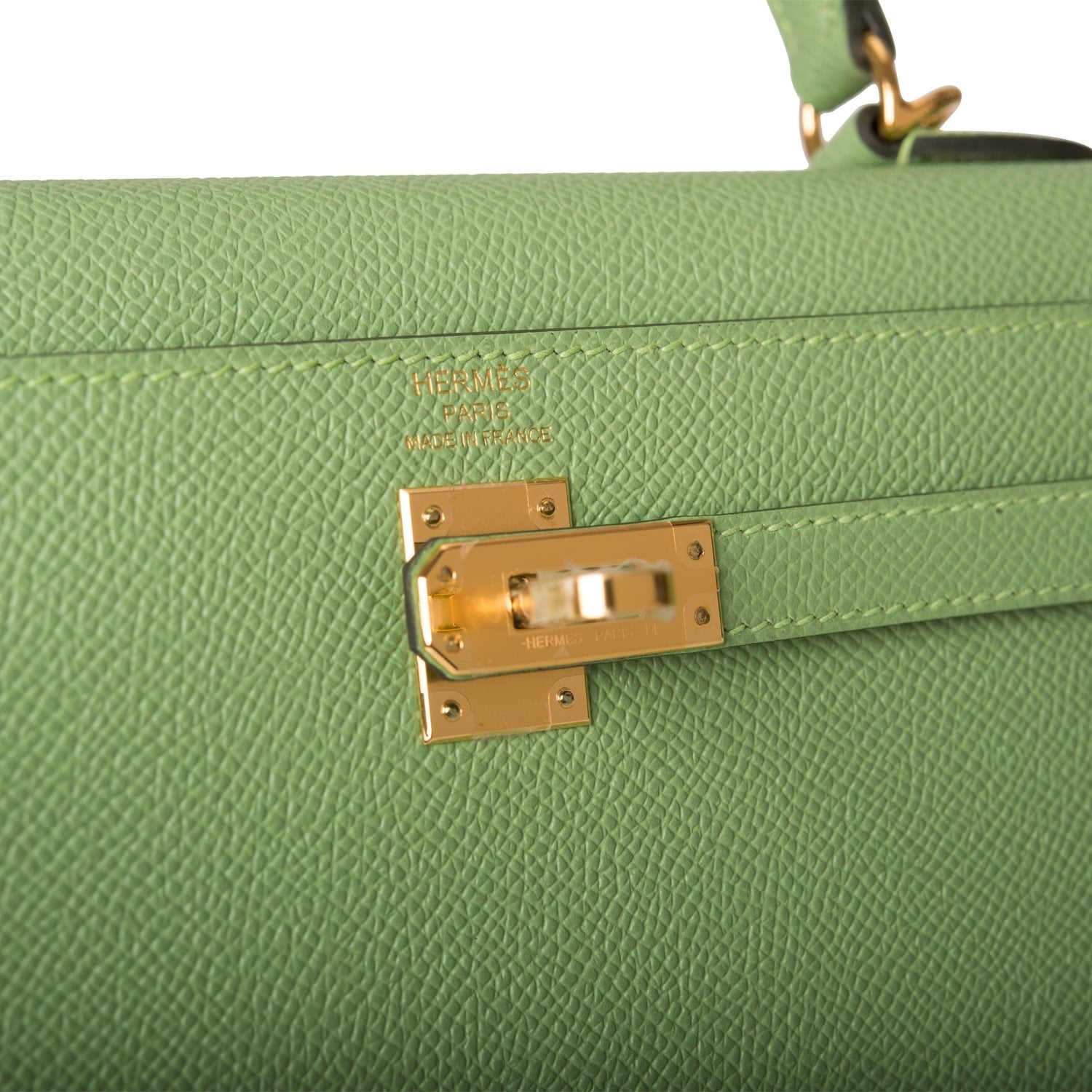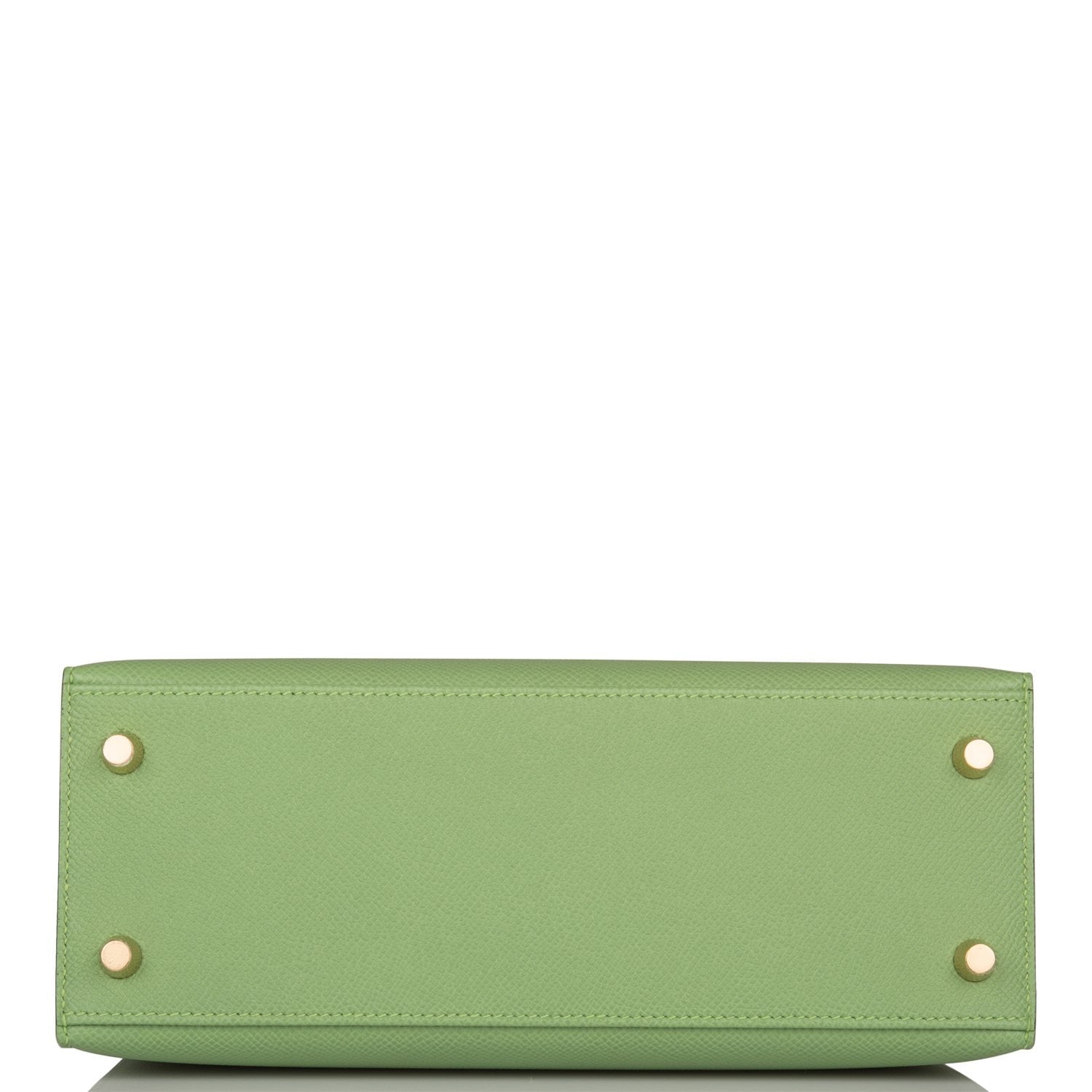 This Kelly, in the Sellier style, is in Vert Criquet epsom leather with gold hardware and has tonal stitching, two straps with front toggle closure, clochette with lock and two keys, single rolled handle and removable shoulder strap.