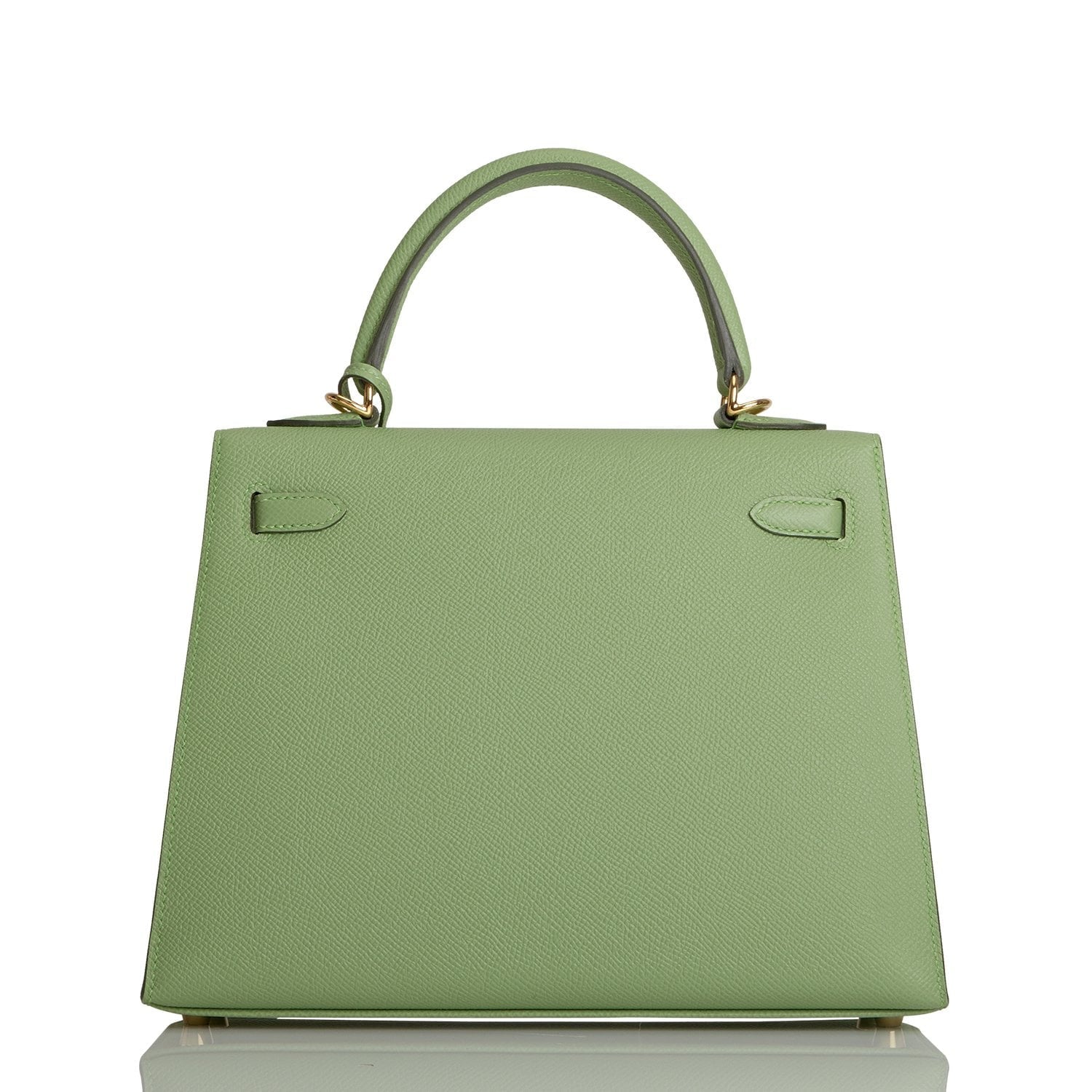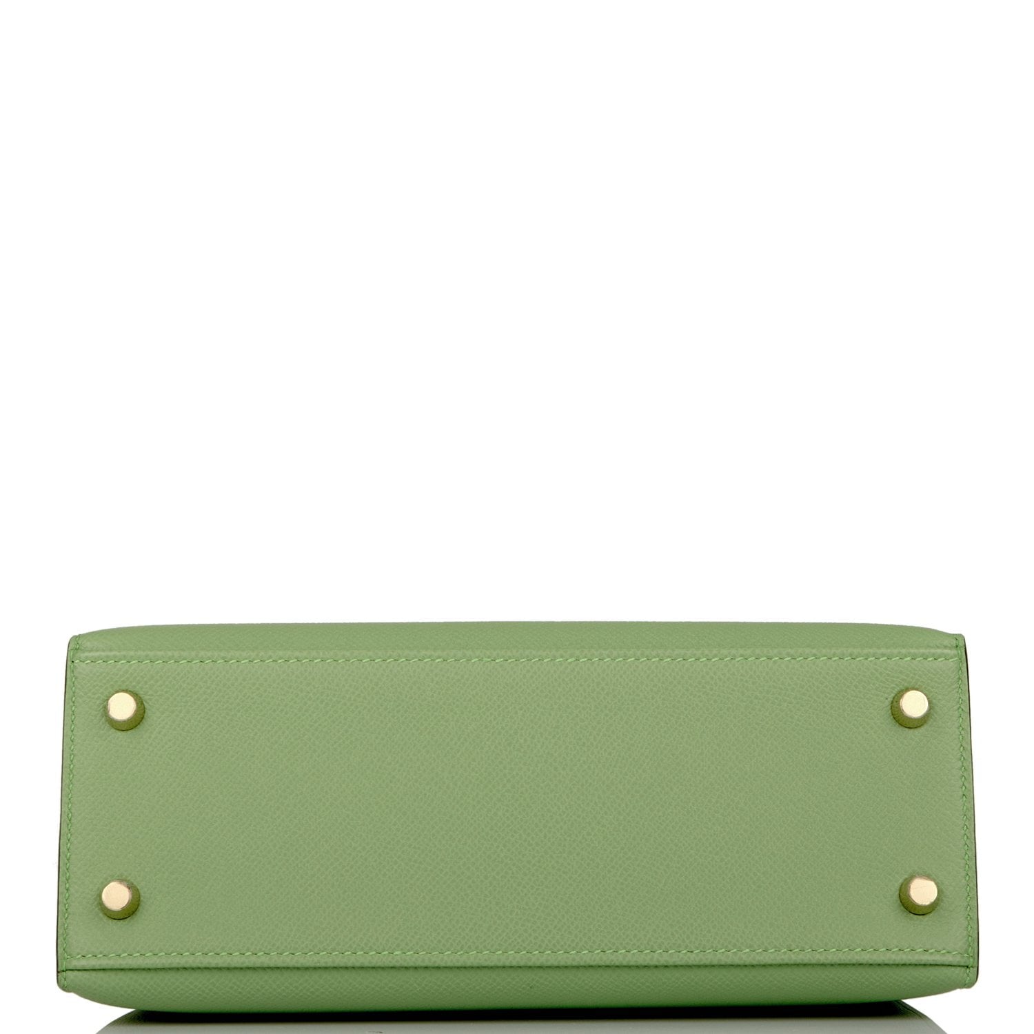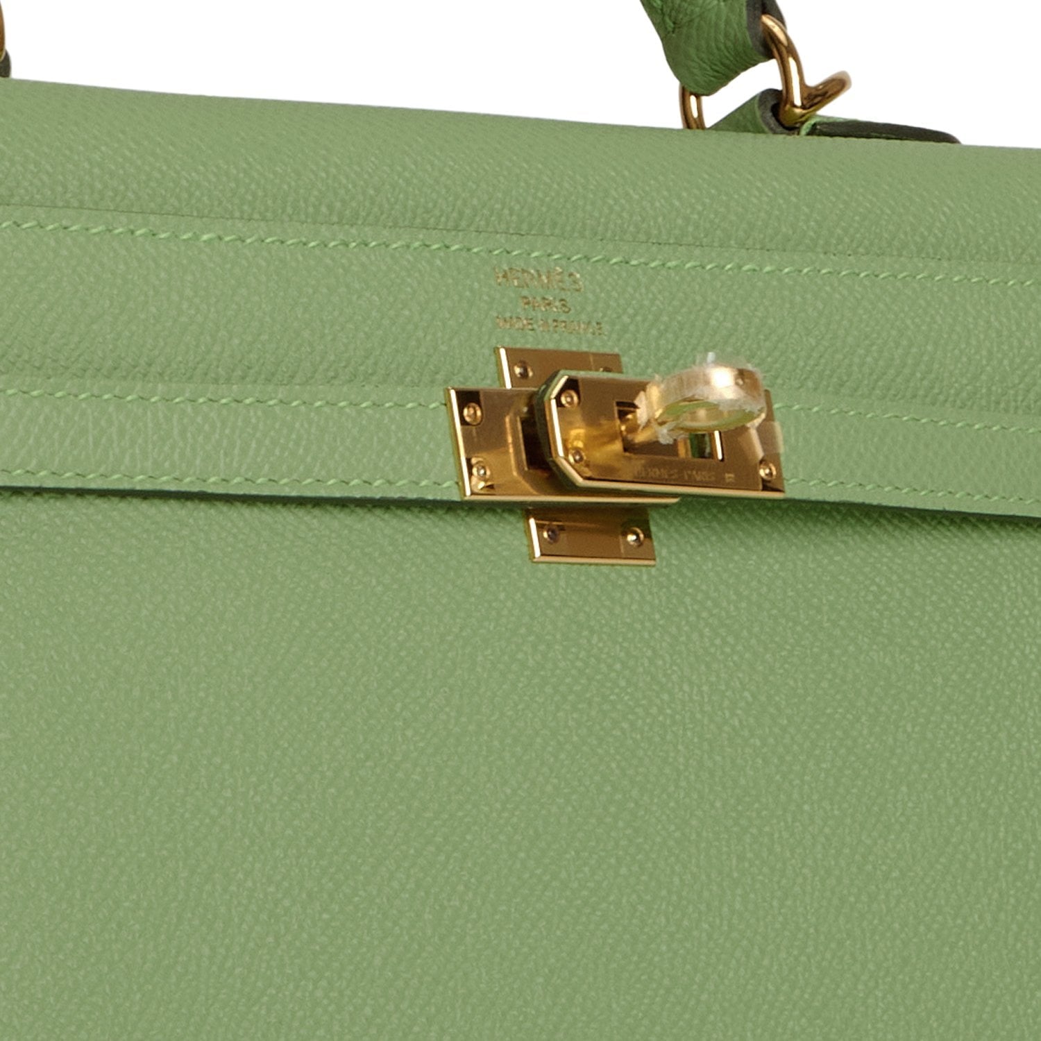 This Kelly, in the Sellier style, is in Vert Criquet epsom leather with gold hardware and has tonal stitching, two straps with front toggle closure, clochette with lock and two keys, single rolled handle and removable shoulder strap.